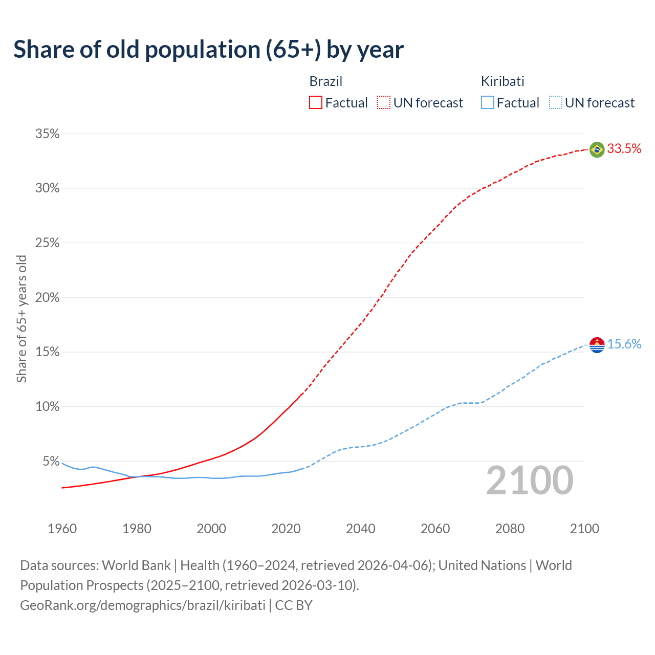 The share of older people aged 65 and over is 11% in Brazil and 4.24% in Kiribati. Life expectancy in Brazil compared to Kiribati .
