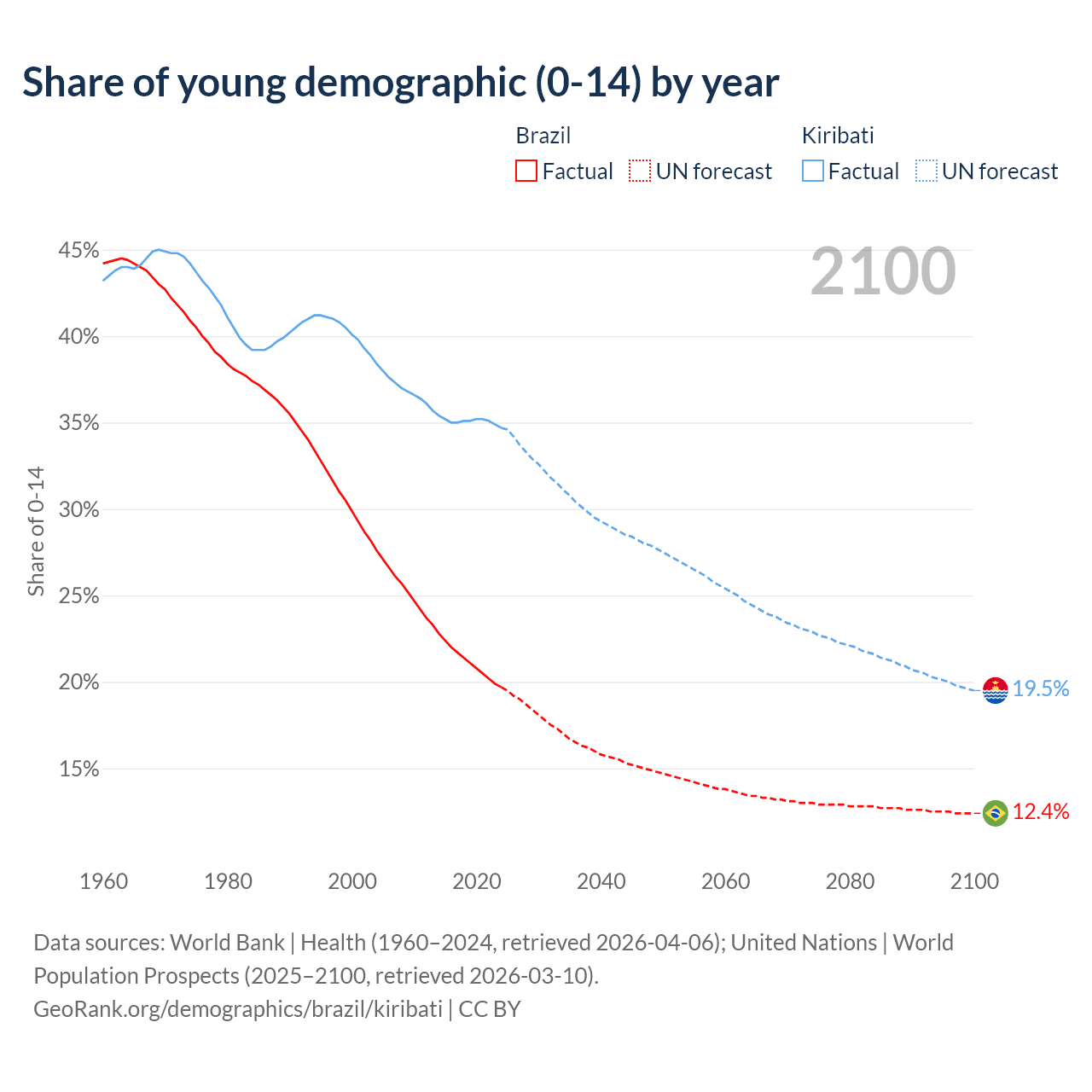 - The share of young demographic (0-15 years old) in Brazil is 19.7% vs 34.7% in Kiribati.