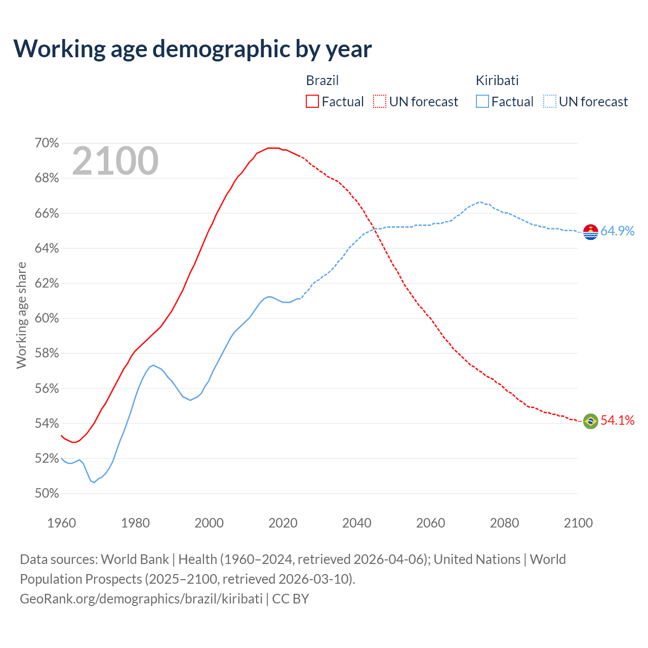 Median age Brazil vs Kiribati, 1960-2100