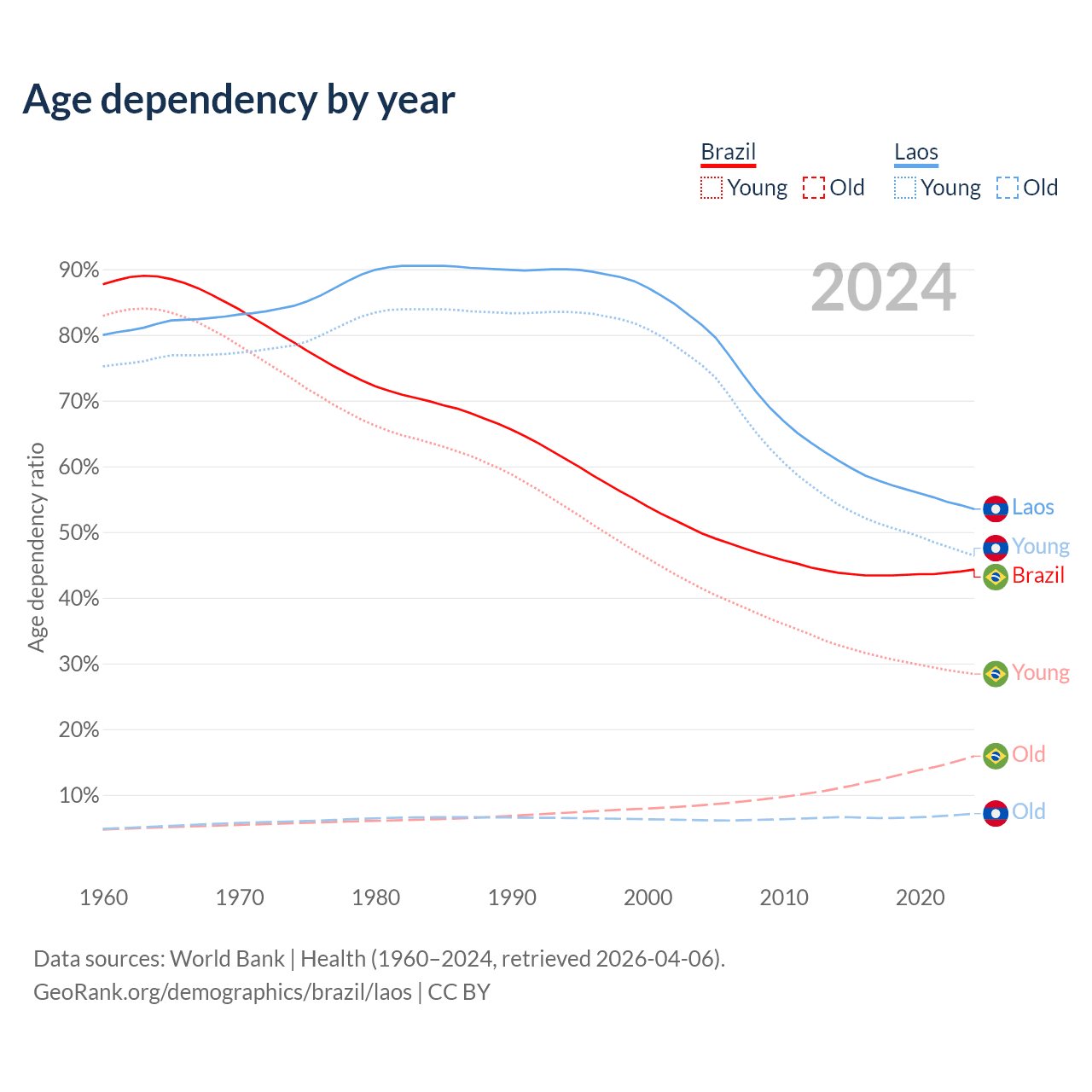 - Brazil is ranked 73/196 by median age (oldest to youngest) vs 130/196 for Laos.