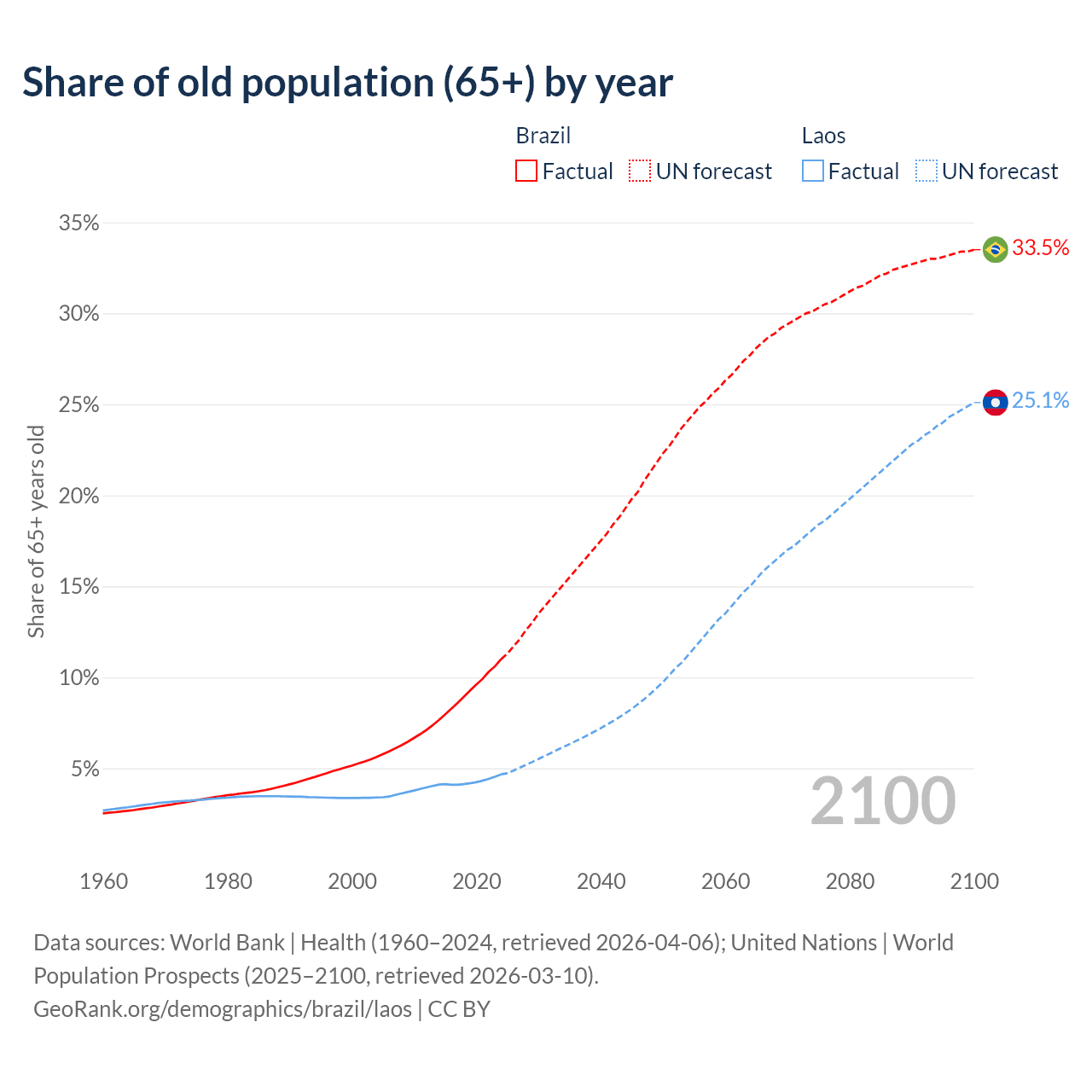 The share of older people aged 65 and over is 11% in Brazil and 4.67% in Laos. Life expectancy in Brazil compared to Laos .