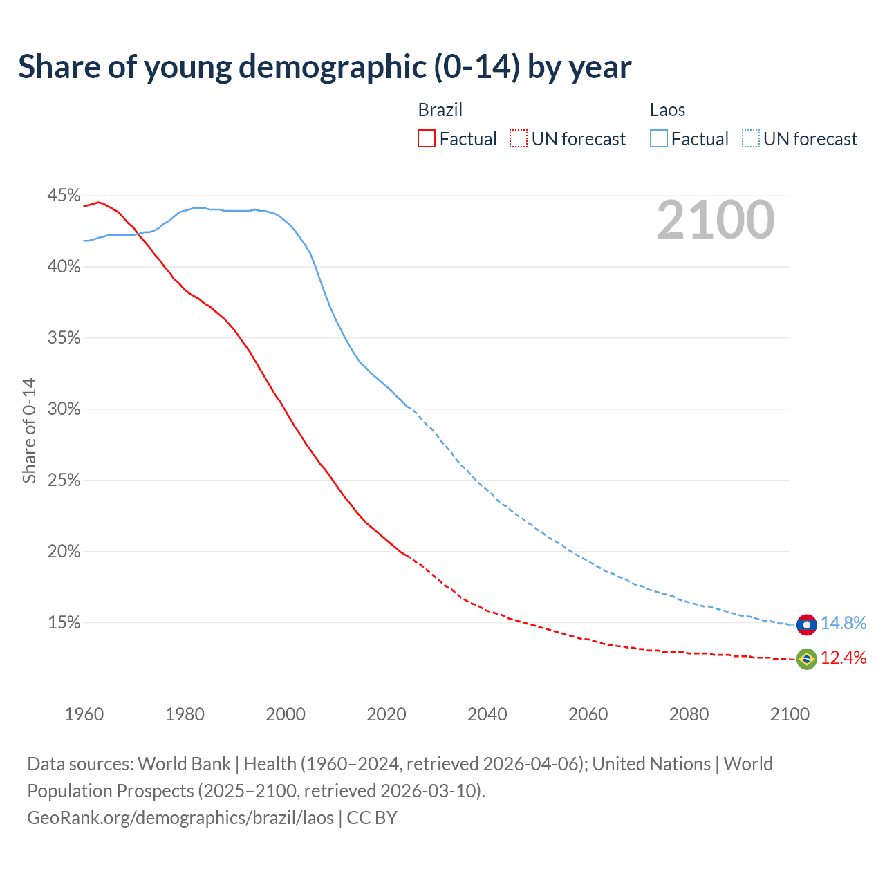 - The share of young demographic (0-15 years old) in Brazil is 19.7% vs 30.2% in Laos.