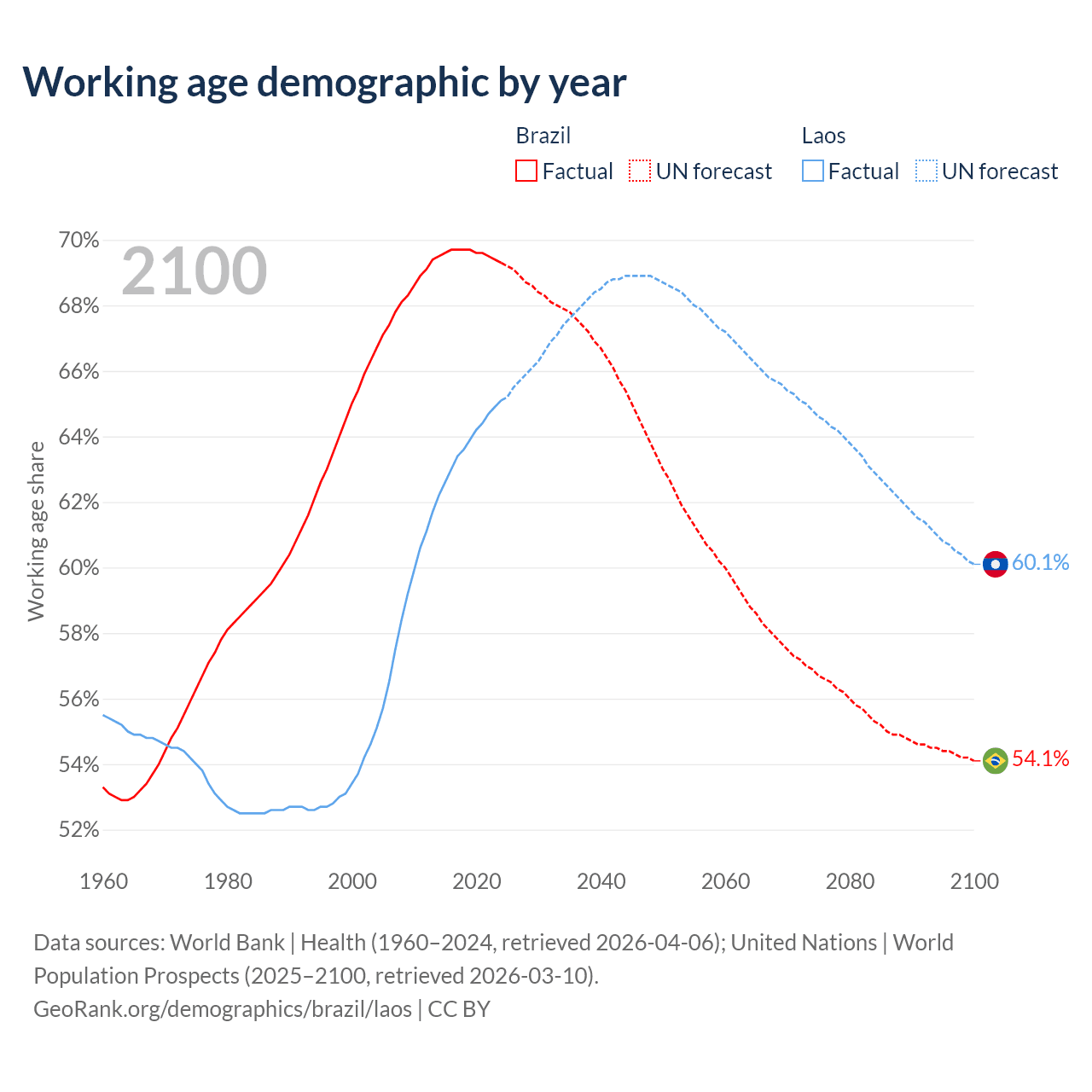 - Brazil has 148M working age adults (aged 15-64) vs 5.21M in Laos.