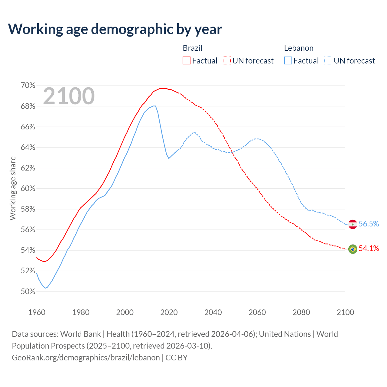 Median age Brazil vs Lebanon, 1960-2100