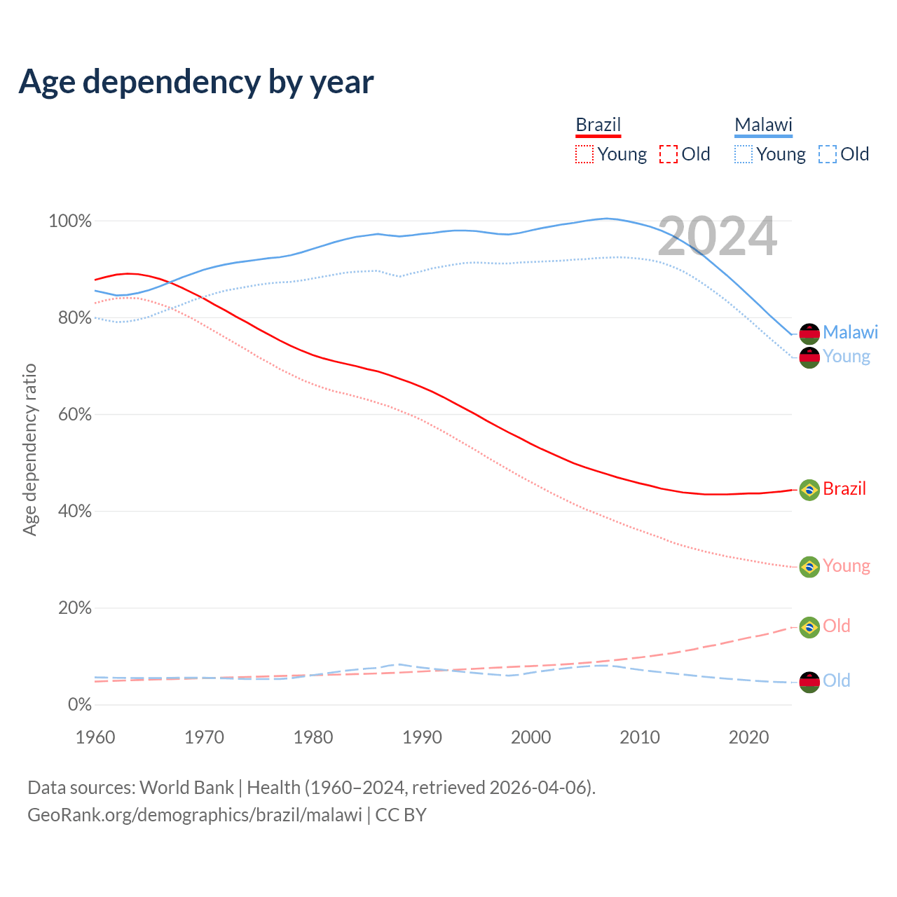- The share of old-age demographic (65+) in Brazil is 11% vs 2.59% in Malawi.