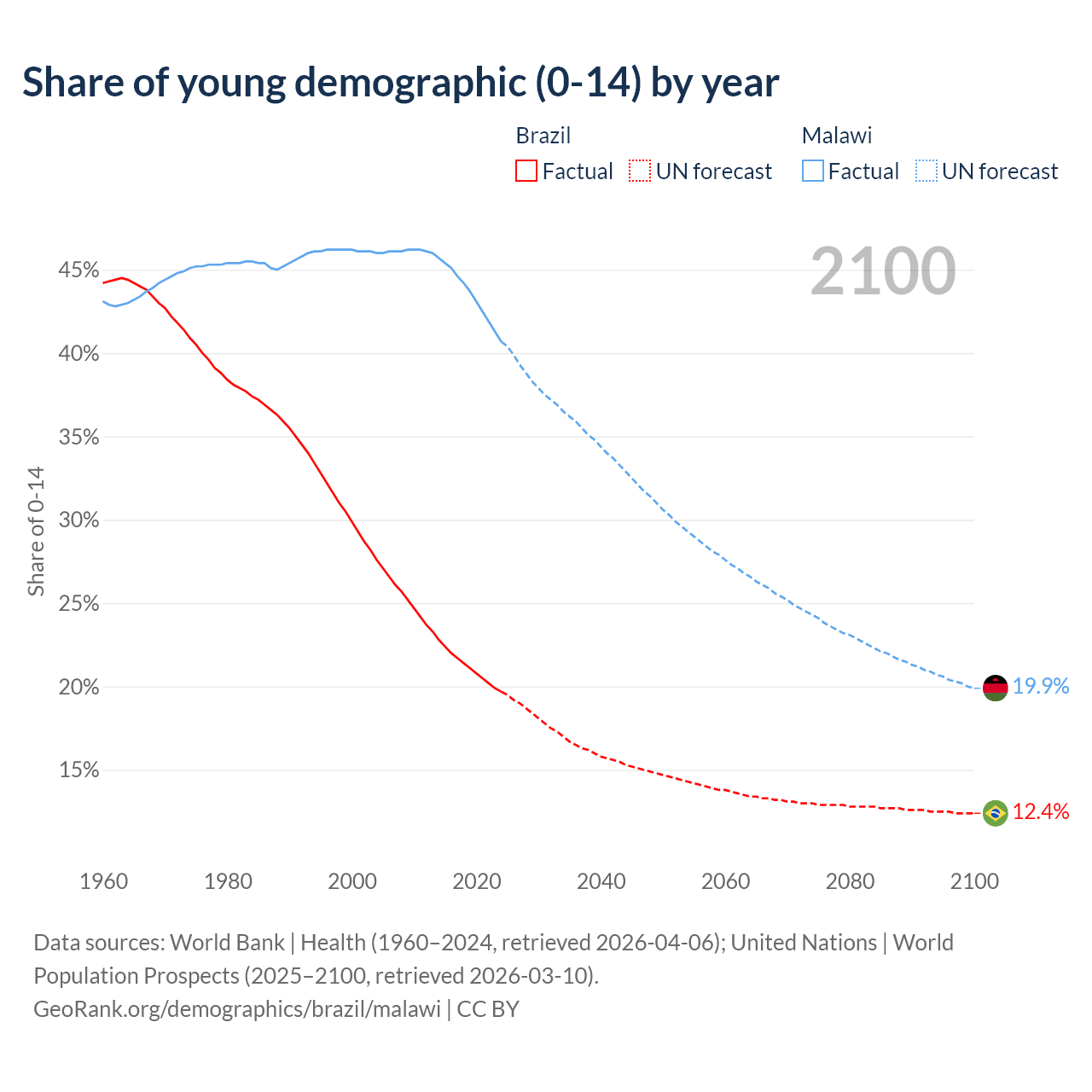 - The share of young demographic (0-15 years old) in Brazil is 19.7% vs 40.7% in Malawi.