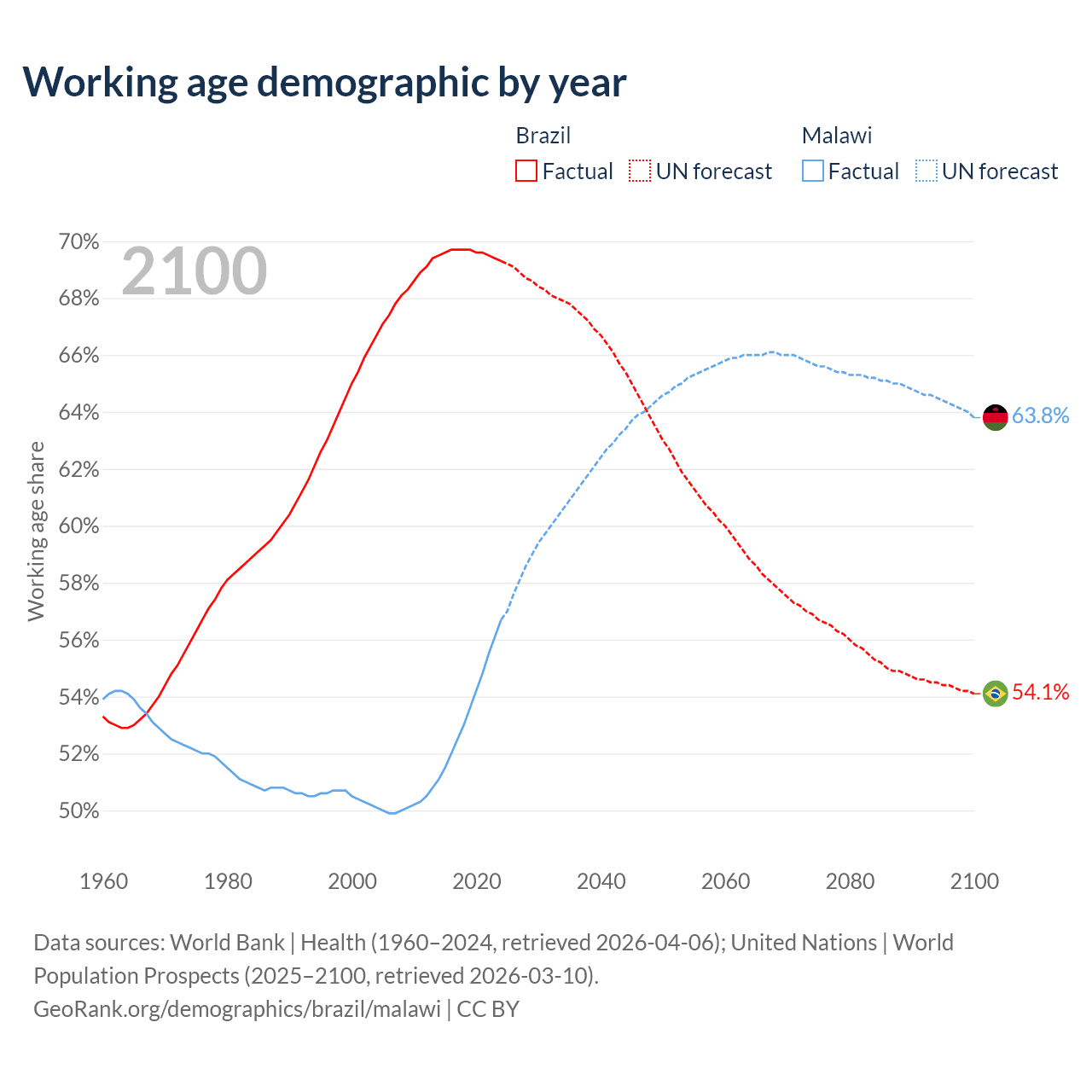 Median age Brazil vs Malawi, 1960-2100