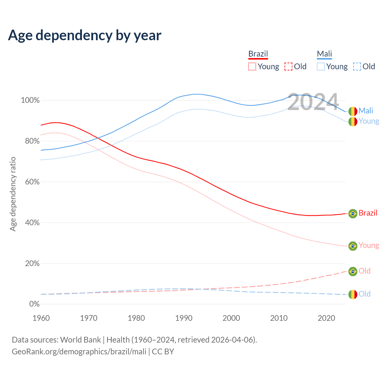 - Brazil is ranked 73/196 by median age (oldest to youngest) vs 193/196 for Mali.