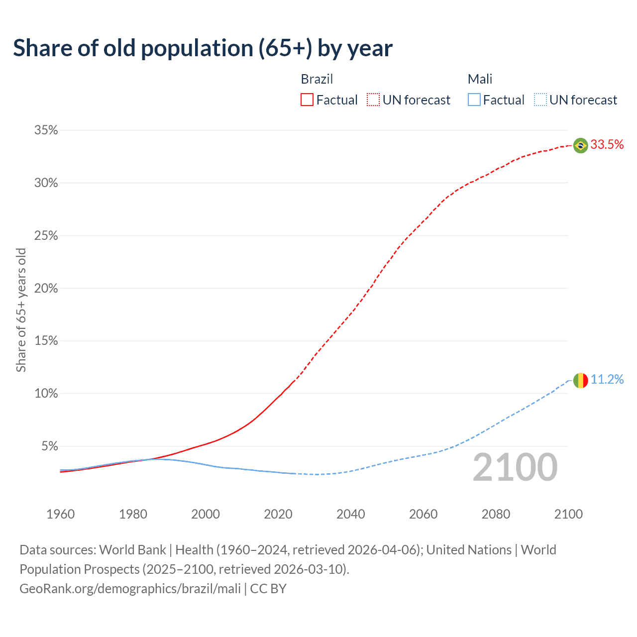 The share of older people aged 65 and over is 11% in Brazil and 2.38% in Mali. Life expectancy in Brazil compared to Mali .
