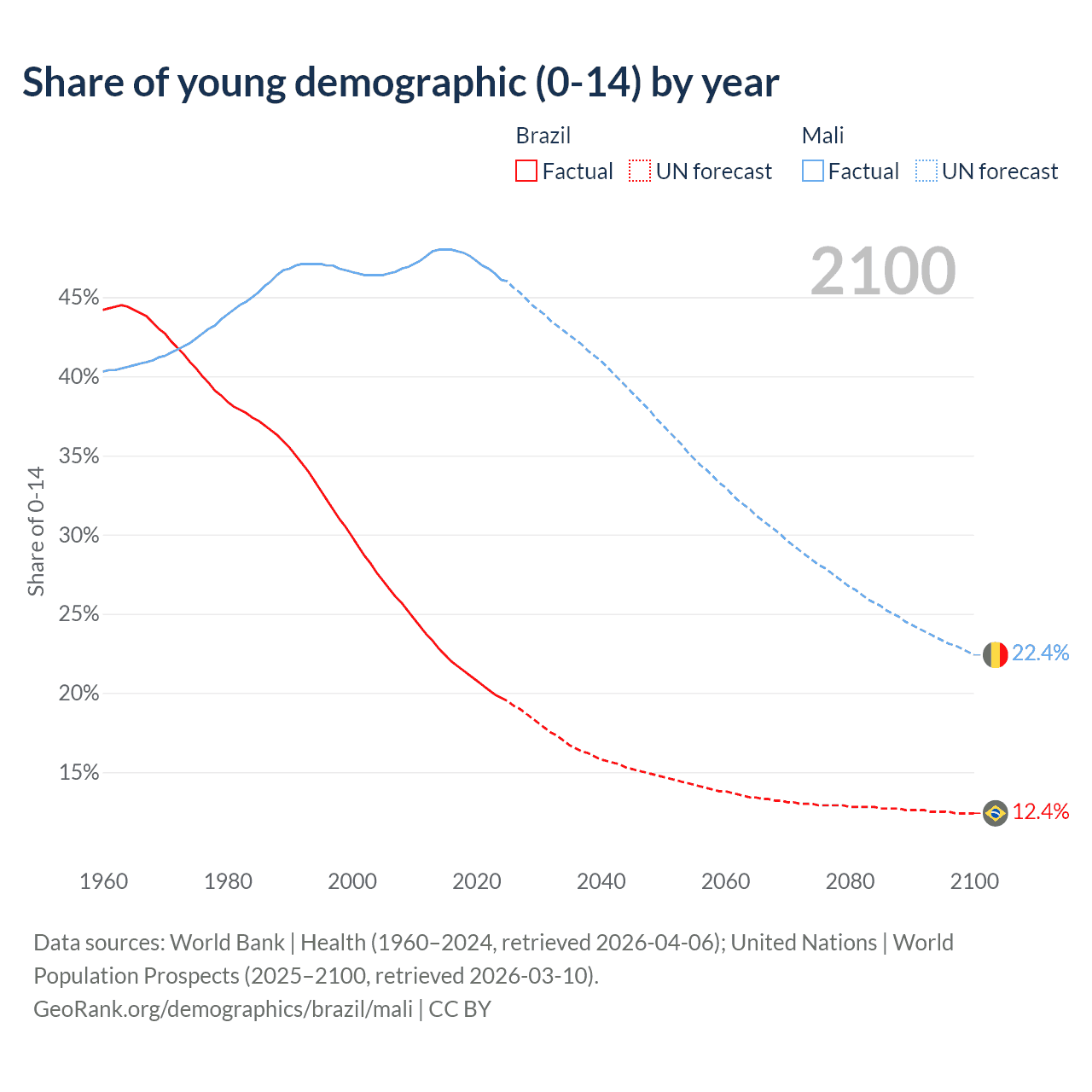 - The share of young demographic (0-15 years old) in Brazil is 19.7% vs 46.1% in Mali.