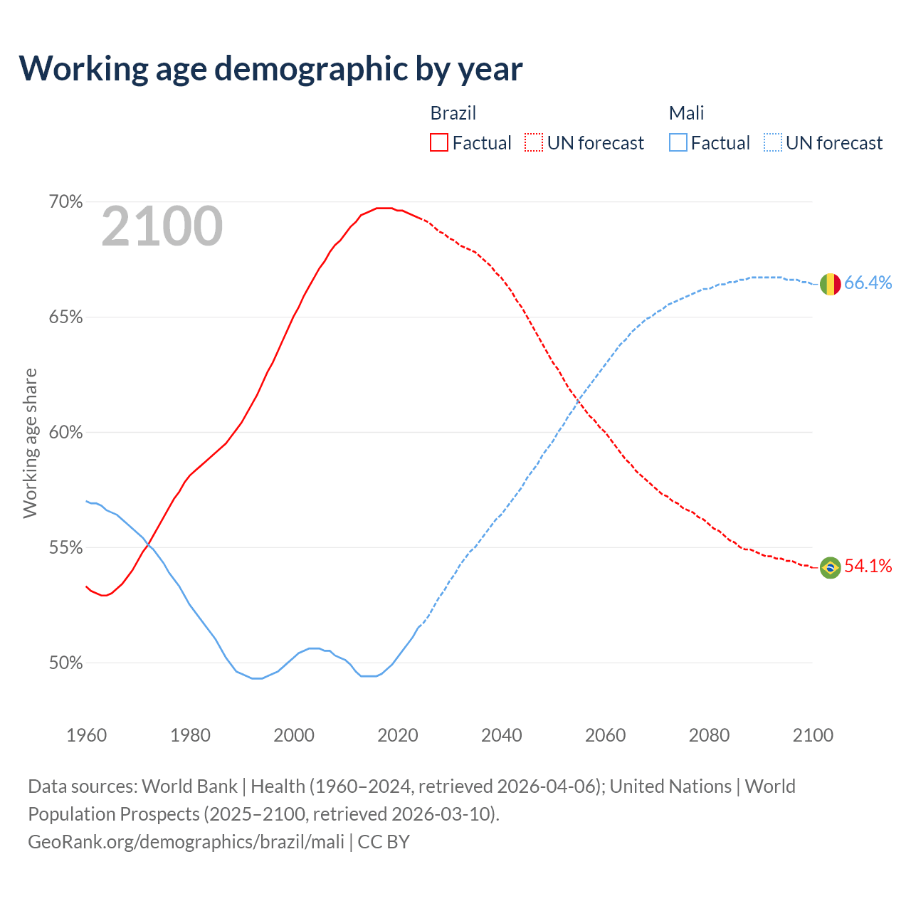 - Brazil has 148M working age adults (aged 15-64) vs 13.5M in Mali.