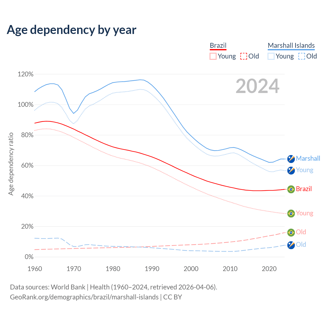 - The share of old-age demographic (65+) in Brazil is 11% vs 4.64% in the Marshall Islands.