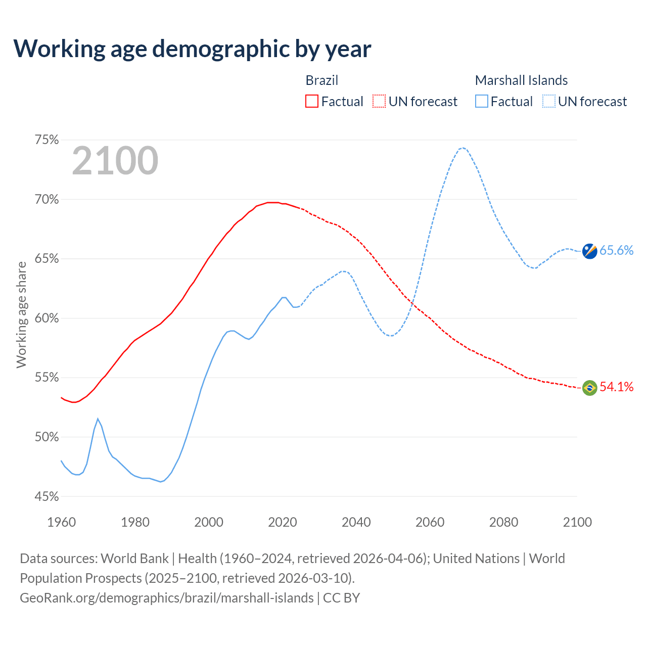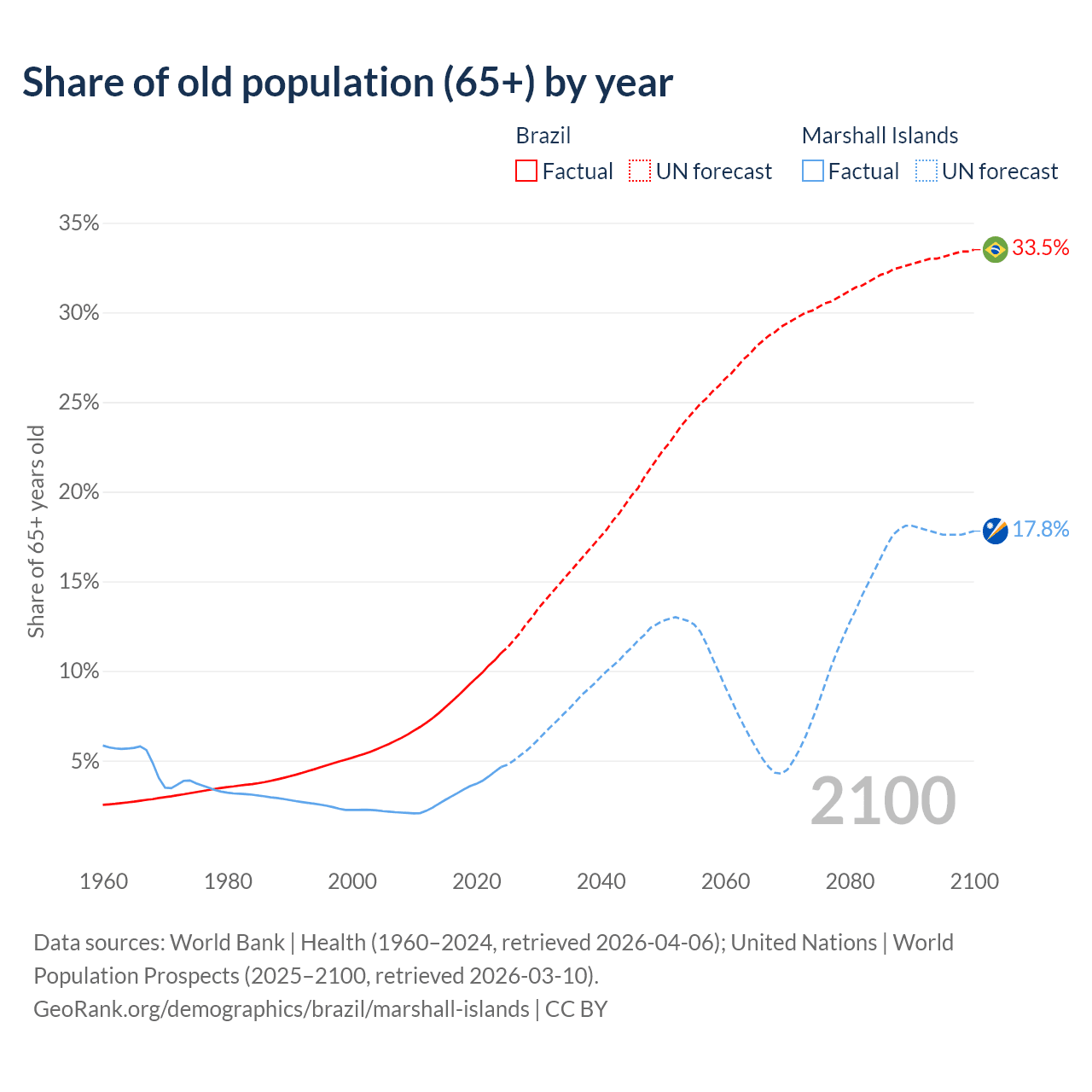 Median age Brazil vs Marshall Islands, 1960-2100