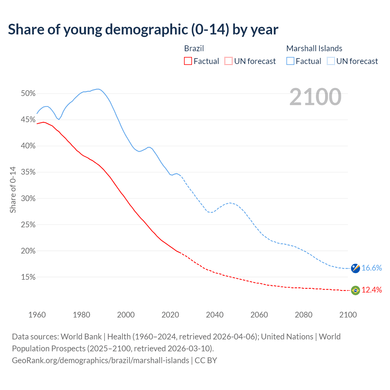 - The share of young demographic (0-15 years old) in Brazil is 19.7% vs 34.5% in the Marshall Islands.