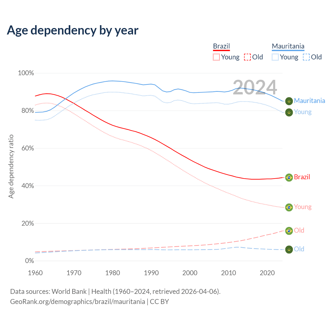 - The share of old-age demographic (65+) in Brazil is 11% vs 3.23% in Mauritania.