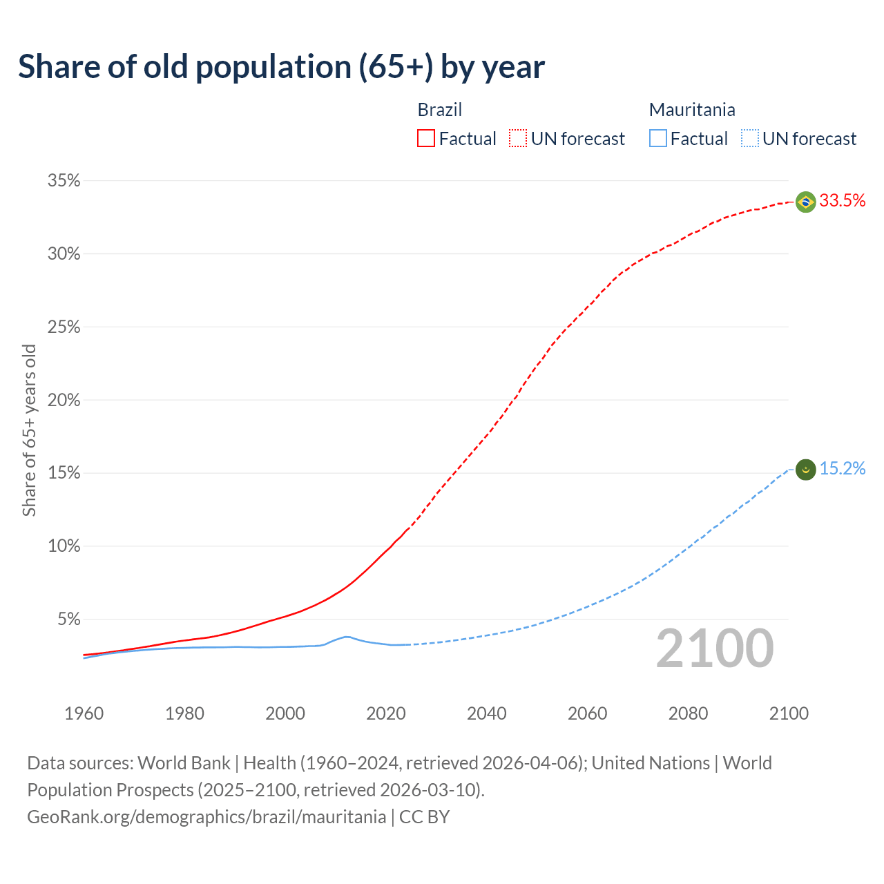 The share of older people aged 65 and over is 11% in Brazil and 3.23% in Mauritania. Life expectancy in Brazil compared to Mauritania .