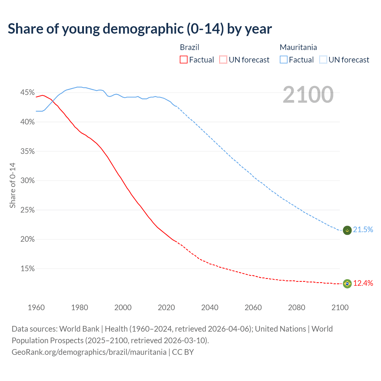 - The share of young demographic (0-15 years old) in Brazil is 19.7% vs 42.7% in Mauritania.