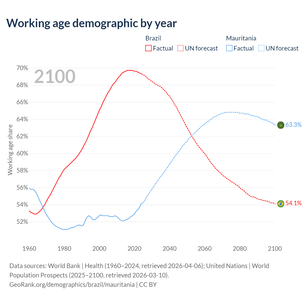 - Brazil has 148M working age adults (aged 15-64) vs 2.98M in Mauritania.