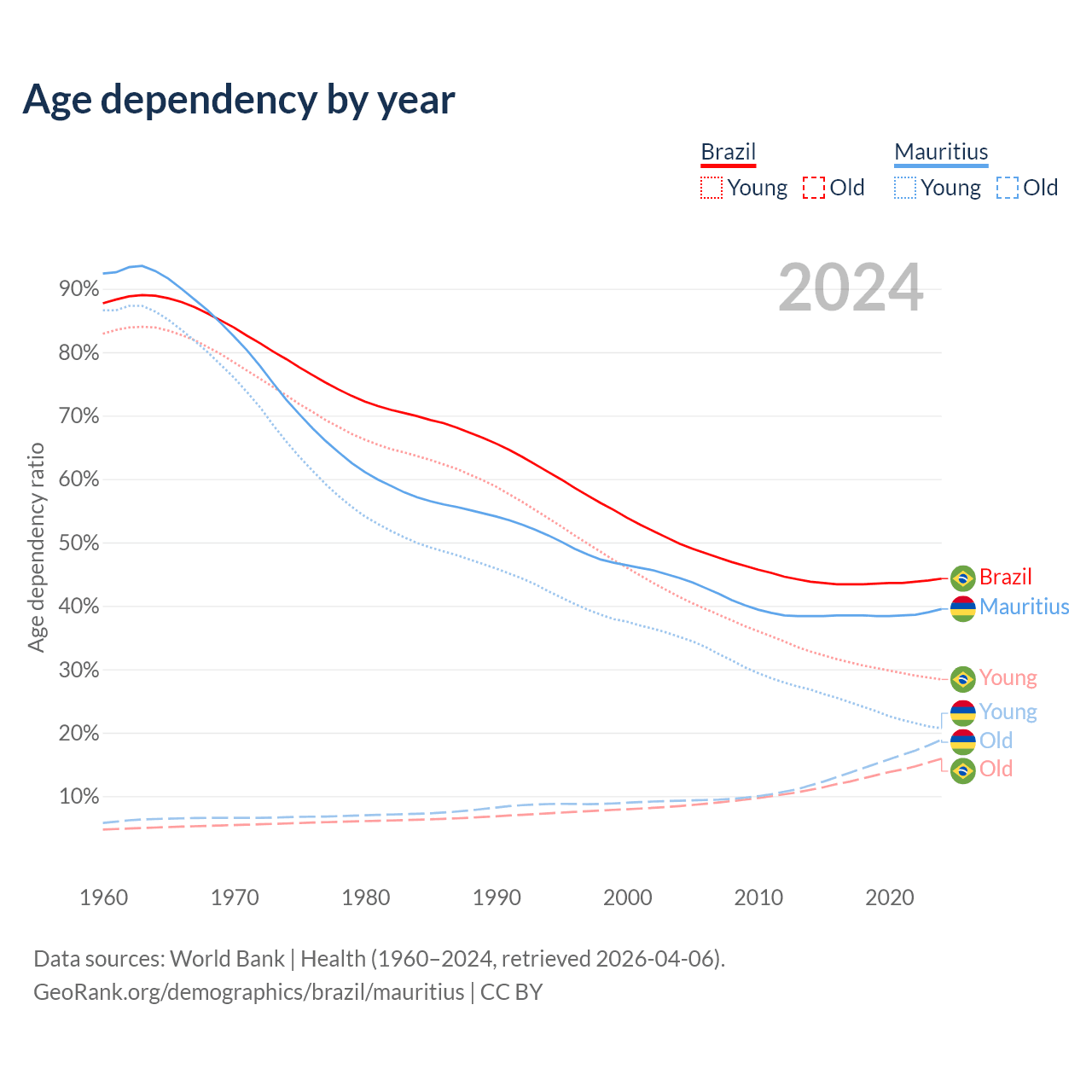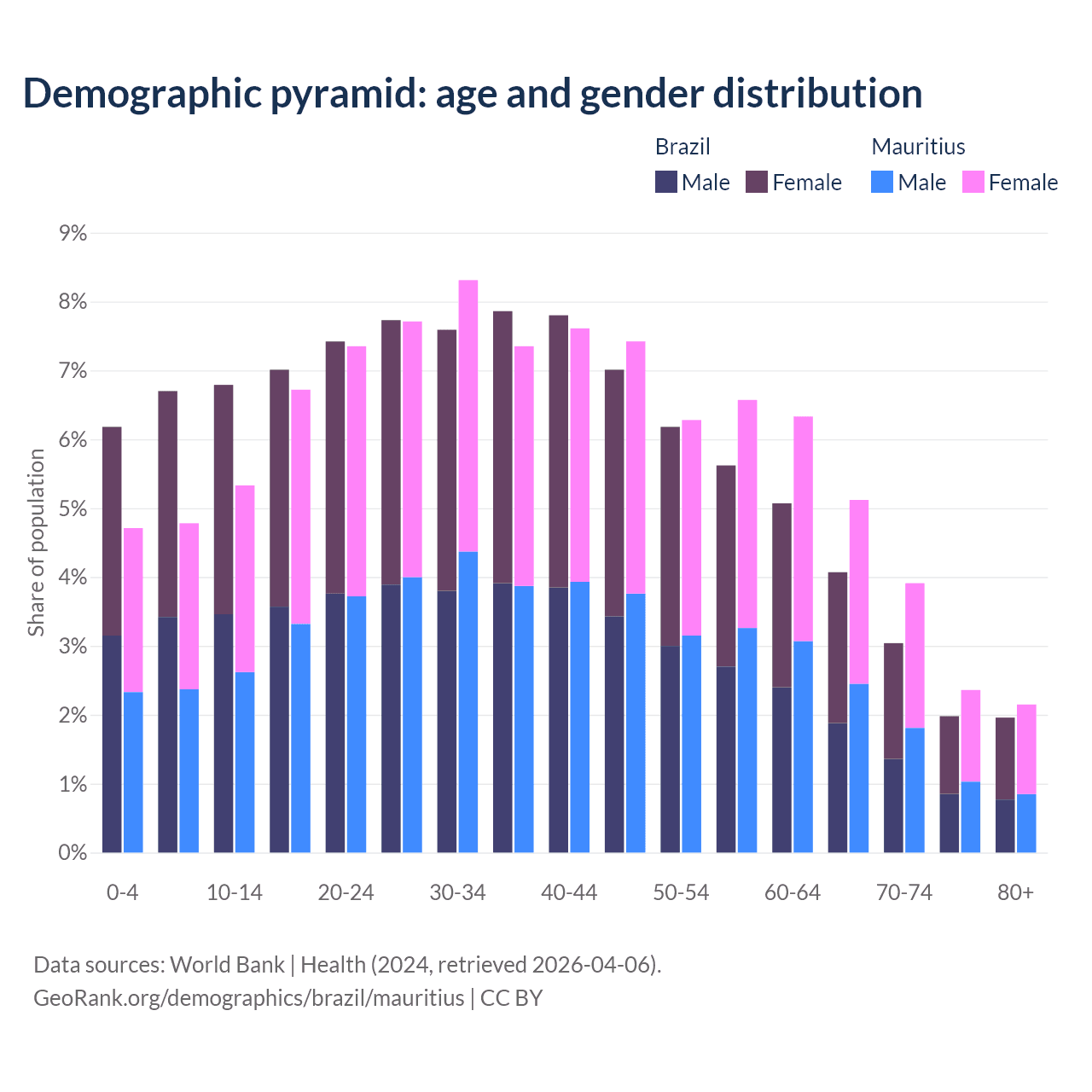 - Brazil is ranked 73/196 by median age (oldest to youngest) vs 57/196 for Mauritius.