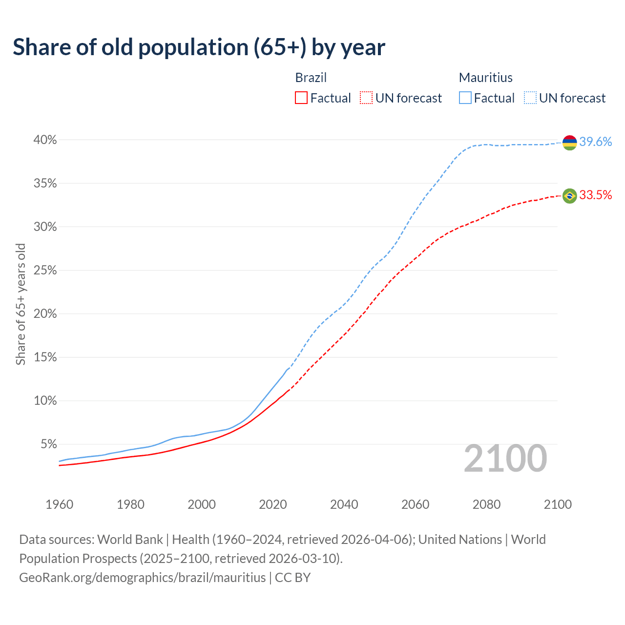 The share of older people aged 65 and over is 11% in Brazil and 13.5% in Mauritius. Life expectancy in Brazil compared to Mauritius .