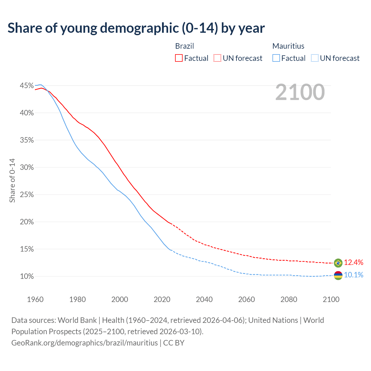 - The share of young demographic (0-15 years old) in Brazil is 19.7% vs 14.8% in Mauritius.