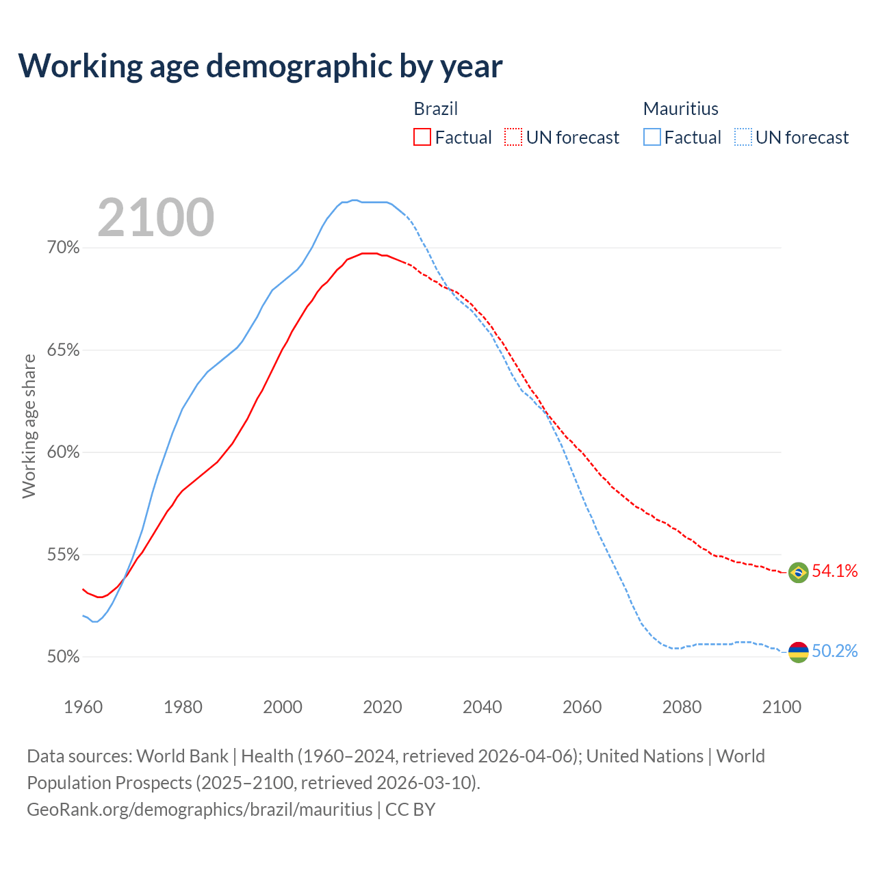 - Brazil has 148M working age adults (aged 15-64) vs 889K in Mauritius.