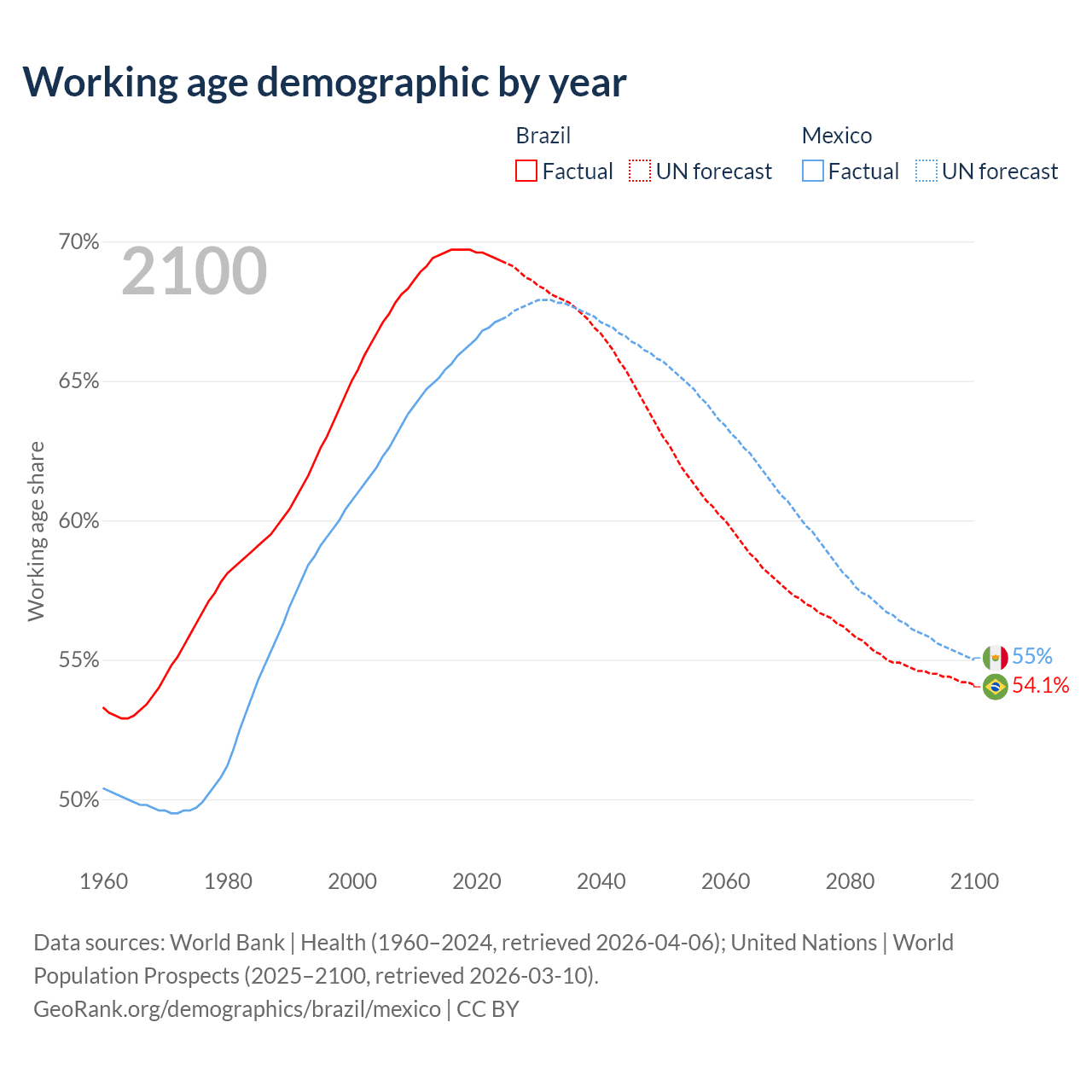 - Brazil has 148M working age adults (aged 15-64) vs 89.6M in Mexico.