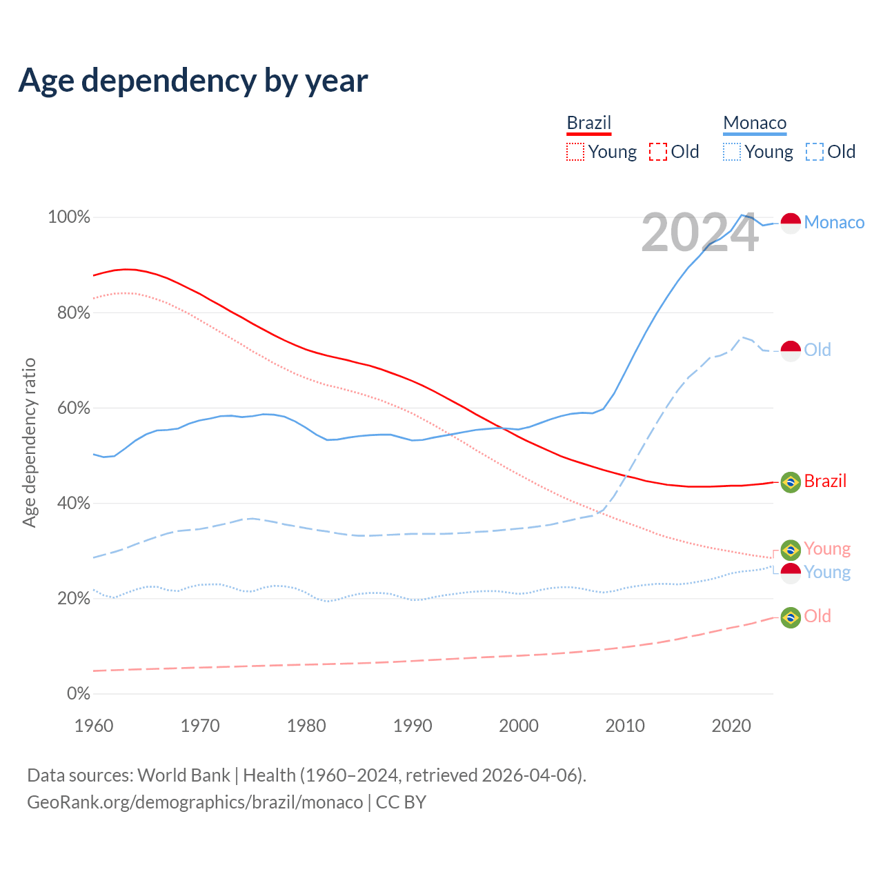 - Brazil is ranked 73/196 by median age (oldest to youngest) vs 1/196 for Monaco.