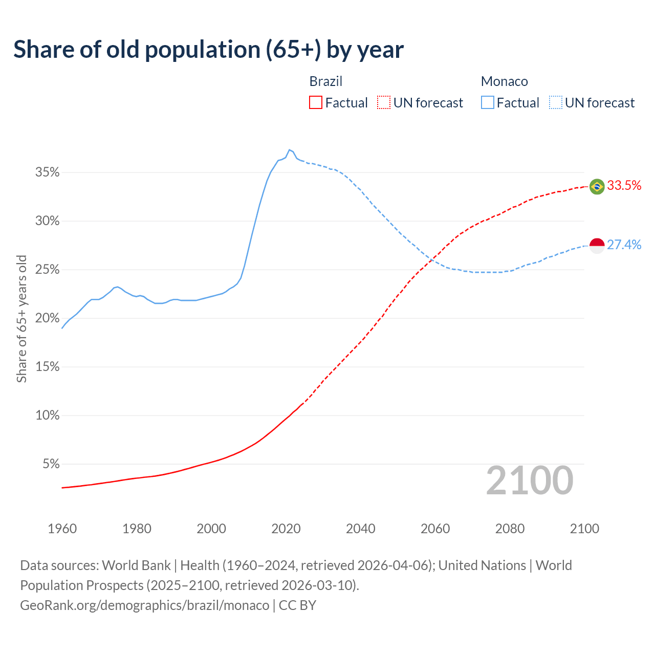 The share of older people aged 65 and over is 11% in Brazil and 36.2% in Monaco. Life expectancy in Brazil compared to Monaco .