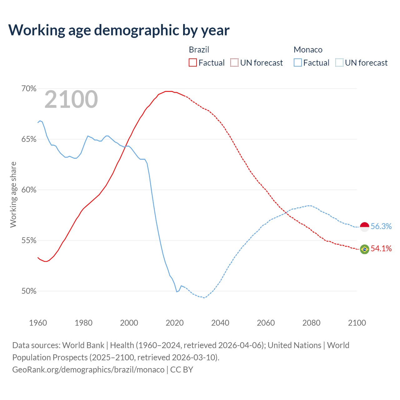 Median age Brazil vs Monaco, 1960-2100