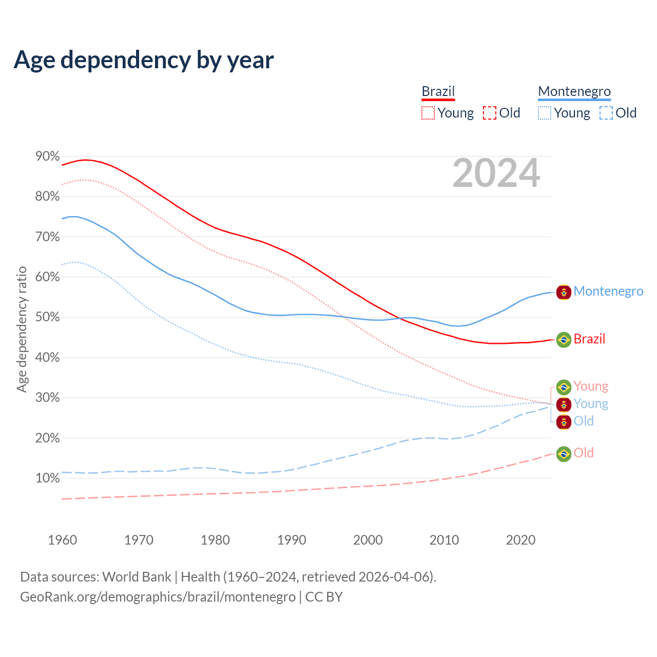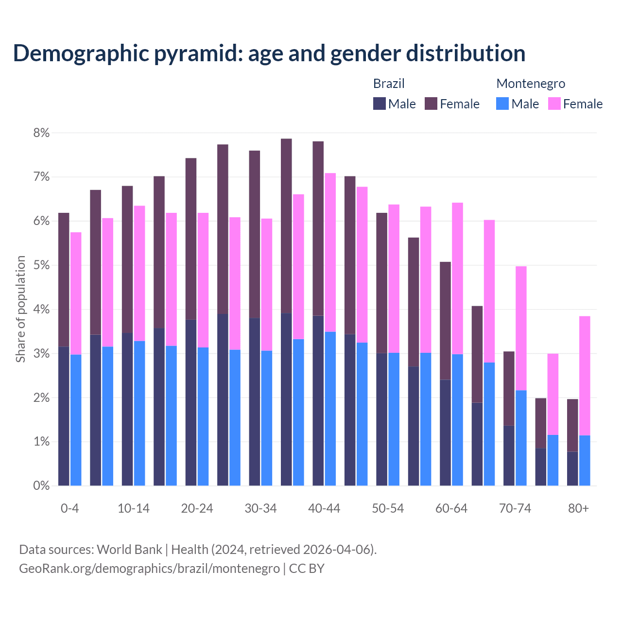 - Brazil is ranked 73/196 by median age (oldest to youngest) vs 45/196 for Montenegro.