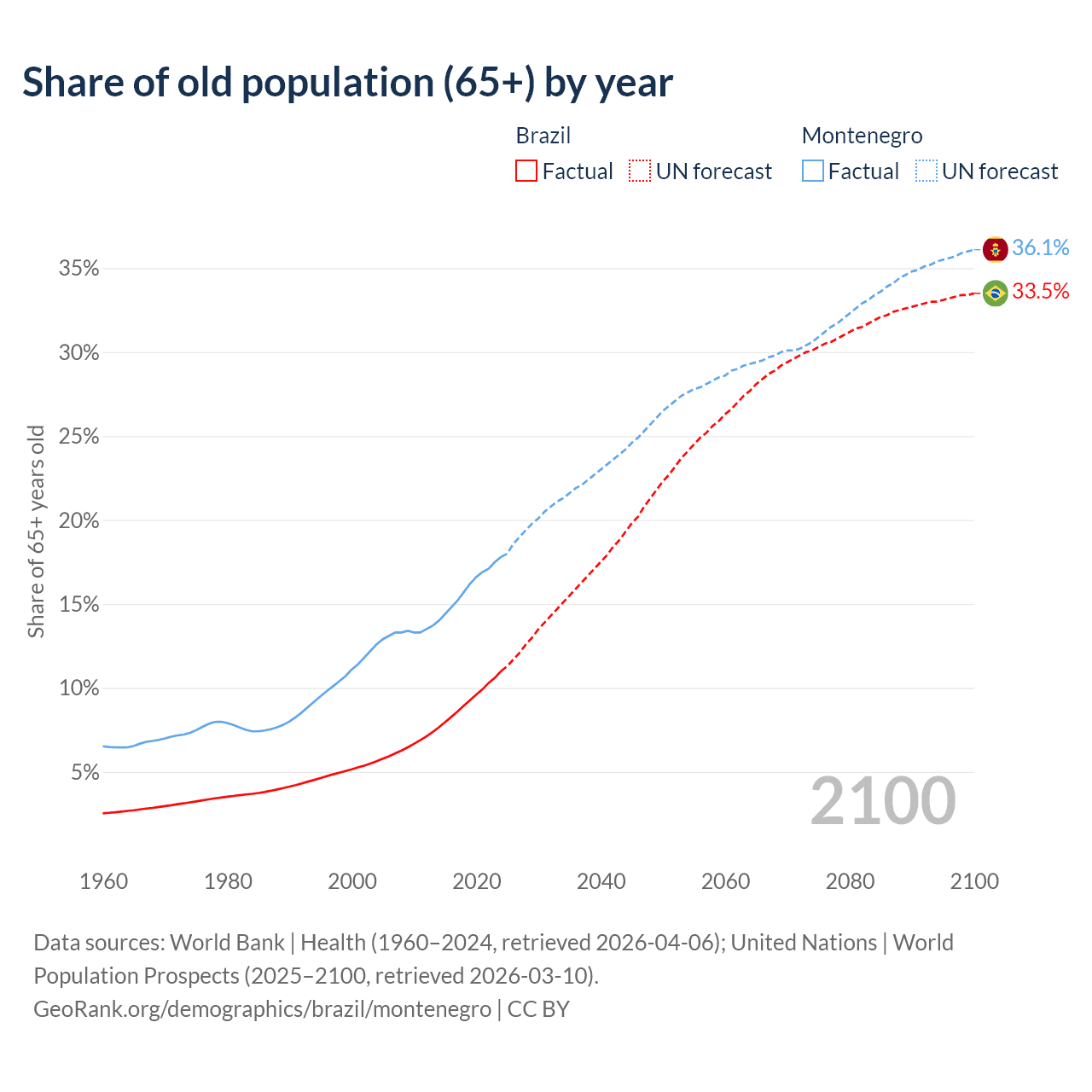 The share of older people aged 65 and over is 11% in Brazil and 17.8% in Montenegro. Life expectancy in Brazil compared to Montenegro .