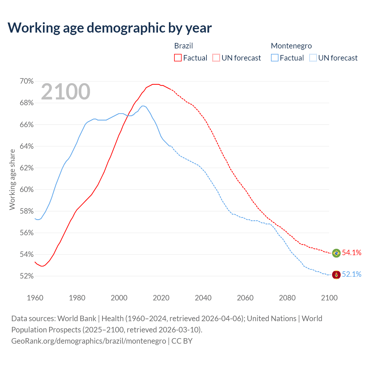 - Brazil has 148M working age adults (aged 15-64) vs 392K in Montenegro.