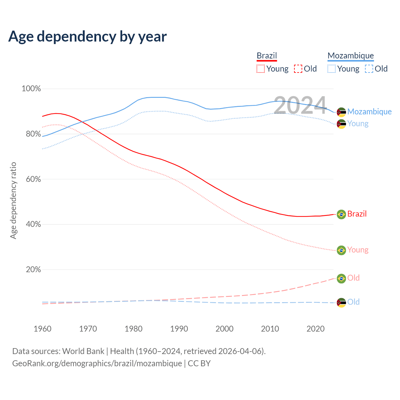 Data sources: World Bank | Health (1960–2024, retrieved 2026-04-06); U.S. Census Bureau (1960–2024, retrieved 2026-02-08).