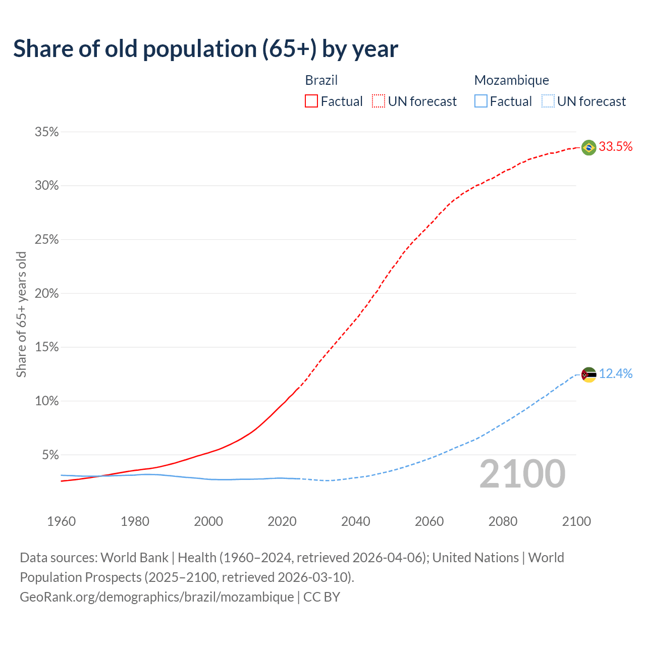 The share of older people aged 65 and over is 11% in Brazil and 2.75% in Mozambique. Life expectancy in Brazil compared to Mozambique .