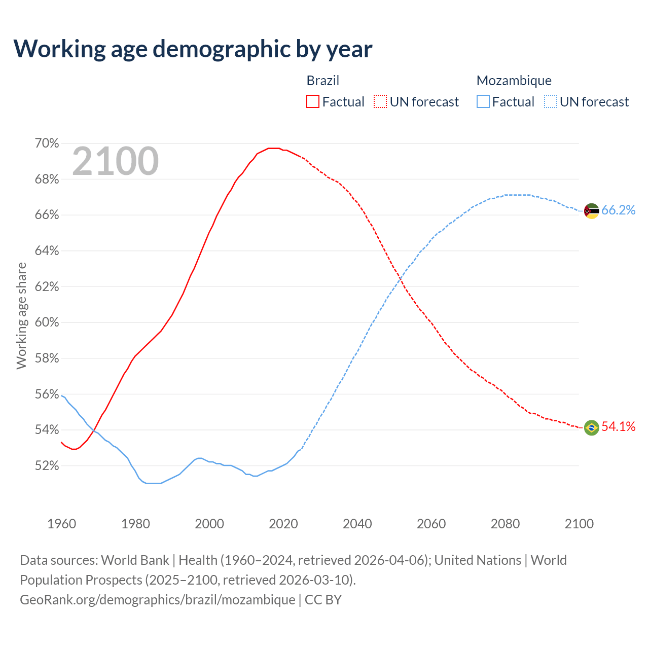 Median age Brazil vs Mozambique, 1960-2100