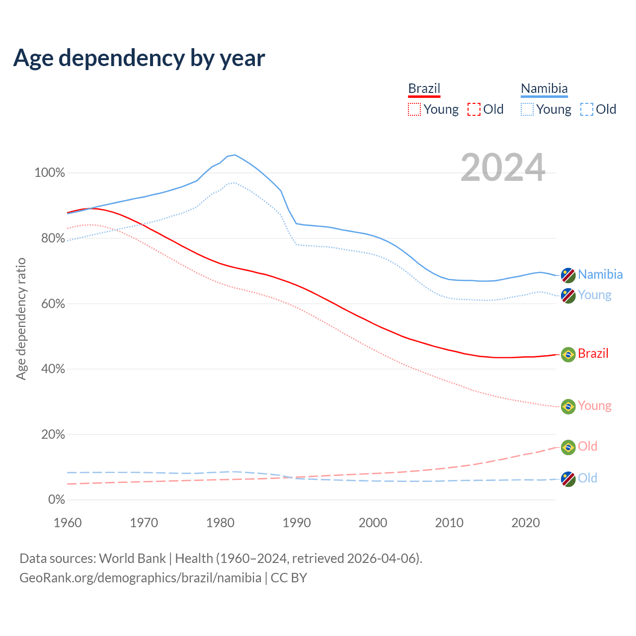 Data sources: World Bank | Health (1960–2024, retrieved 2026-04-06); U.S. Census Bureau (1960–2024, retrieved 2026-02-08).