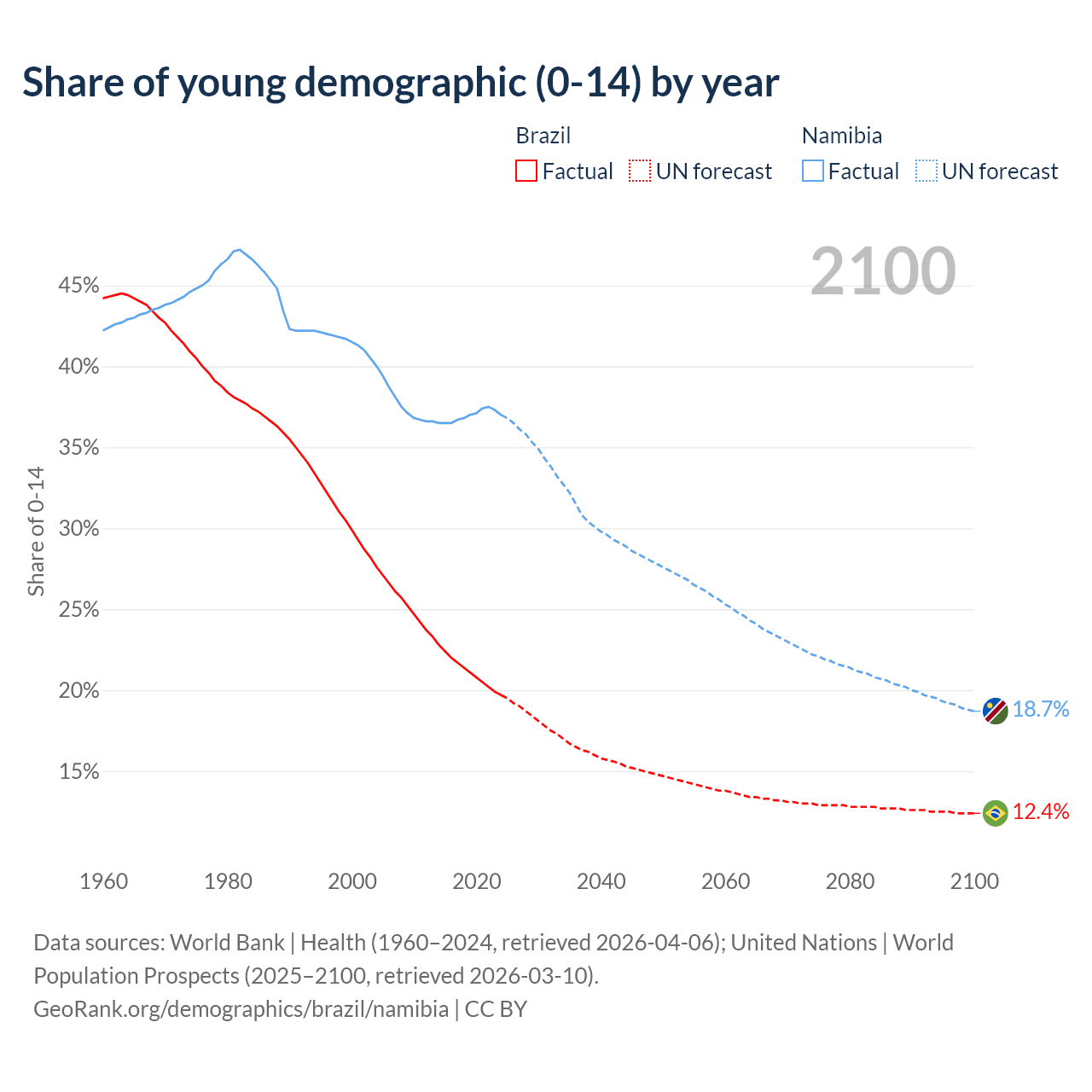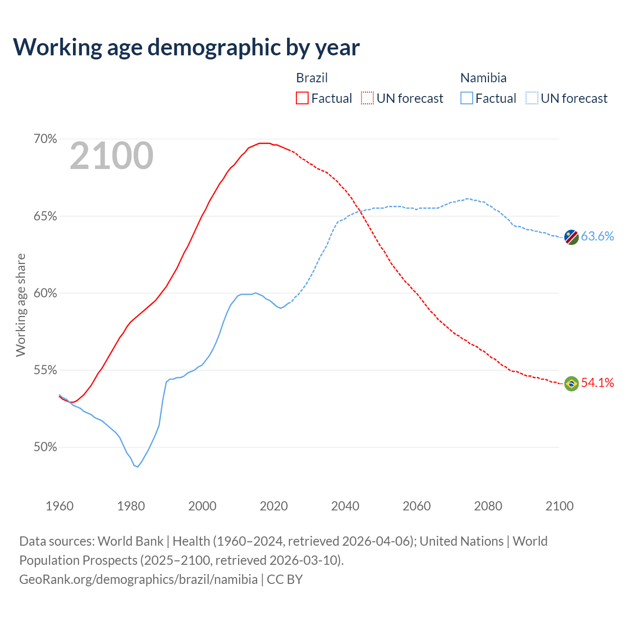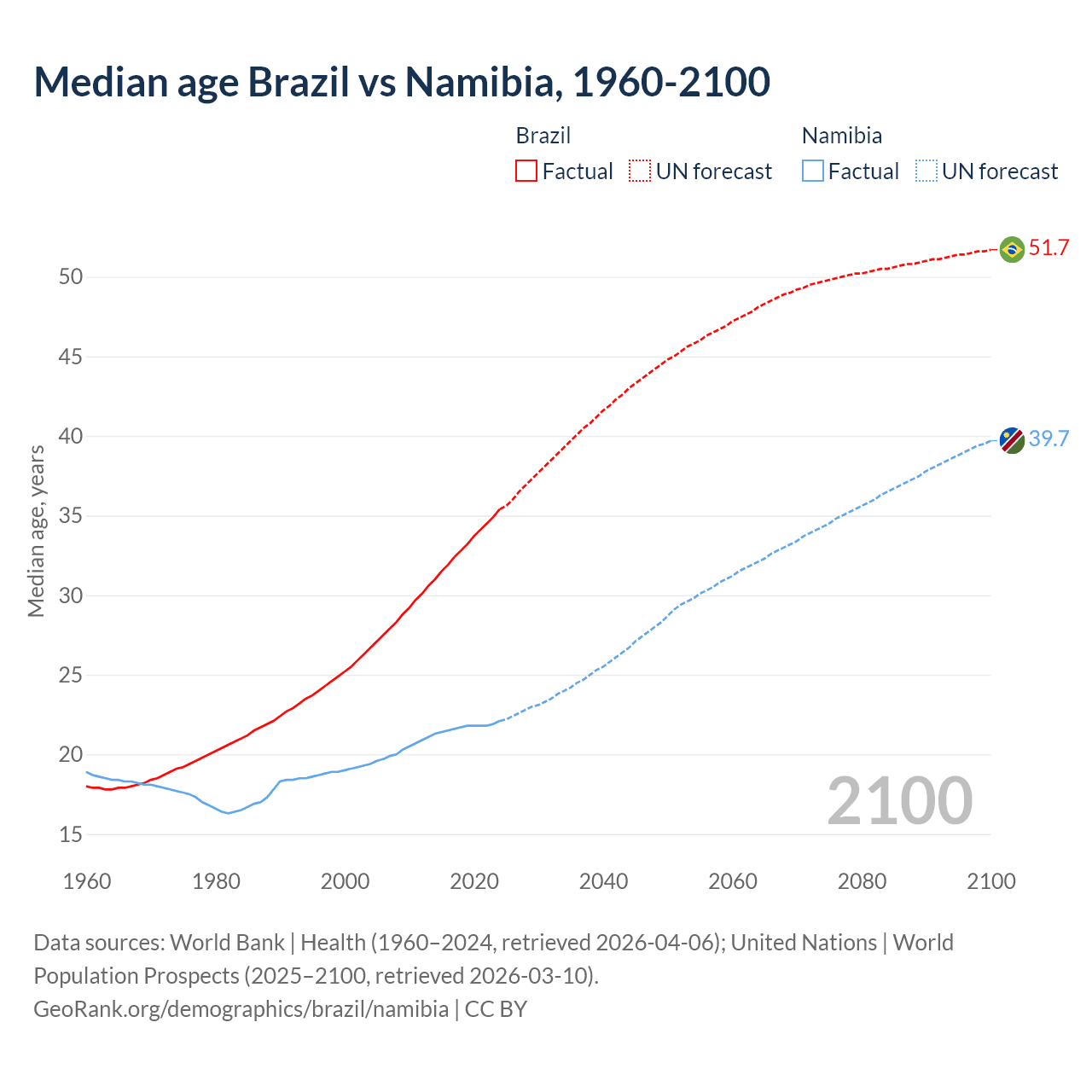 Median age Brazil vs Namibia, 1960-2100