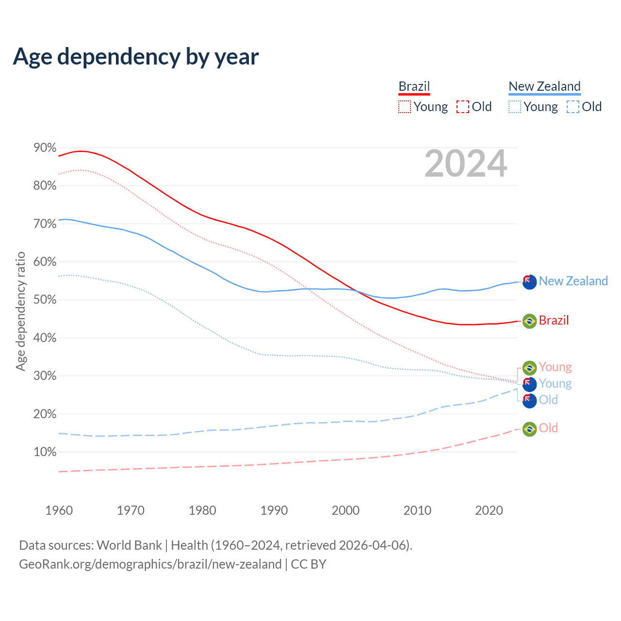 - Brazil is ranked 73/196 by median age (oldest to youngest) vs 56/196 for New Zealand.