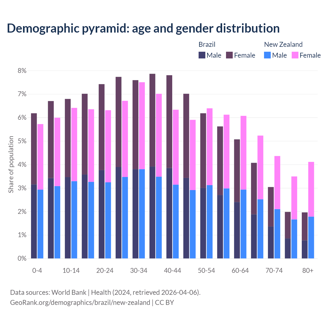 The share of older people aged 65 and over is 11% in Brazil and 17.2% in New Zealand. Life expectancy in Brazil compared to New Zealand .
