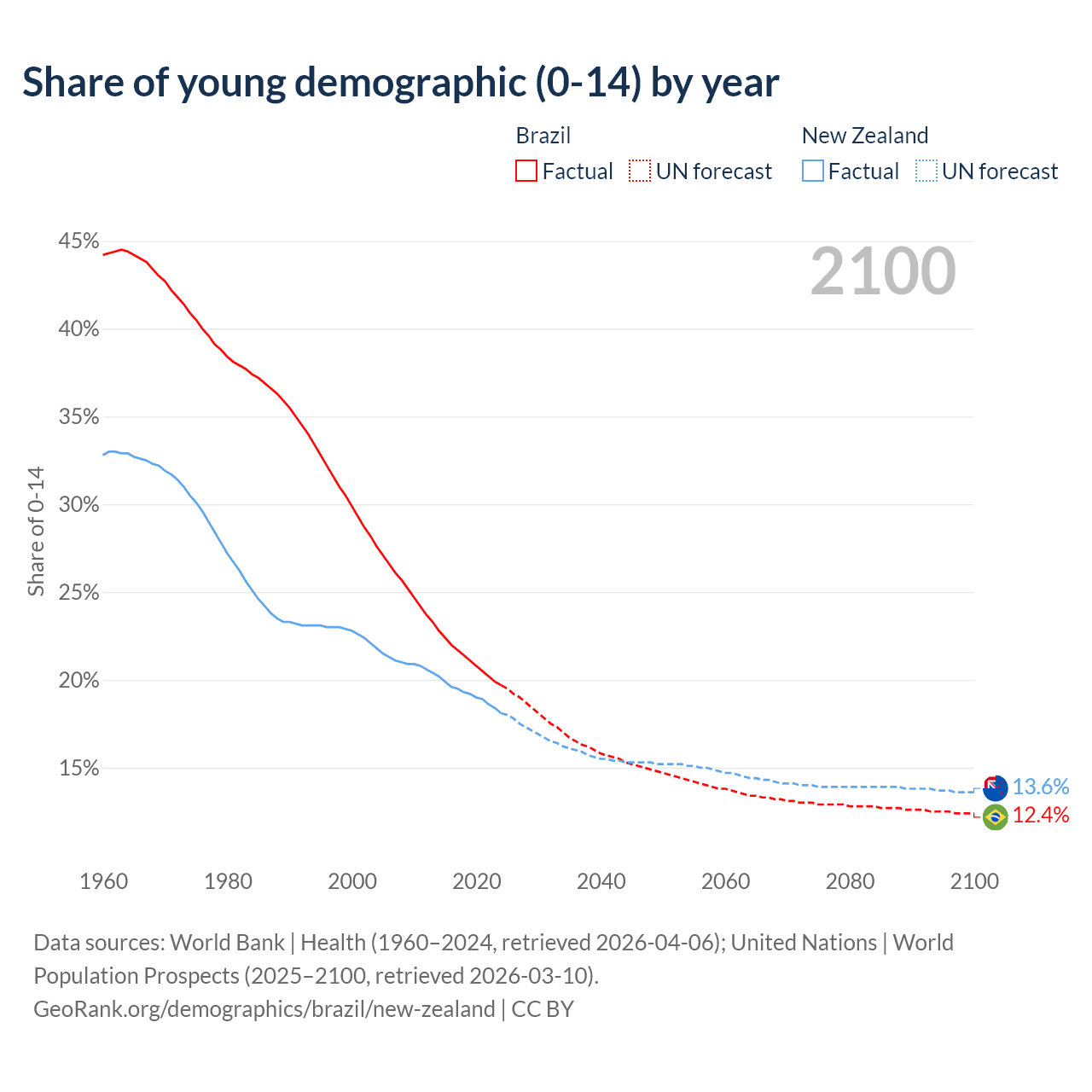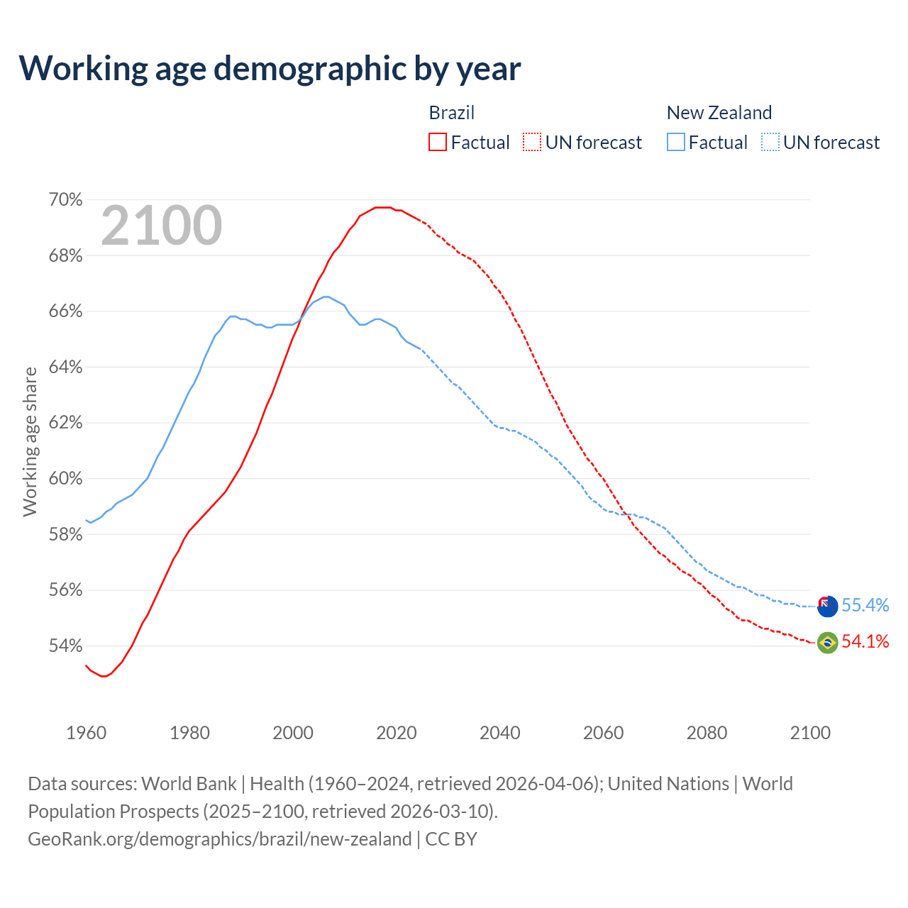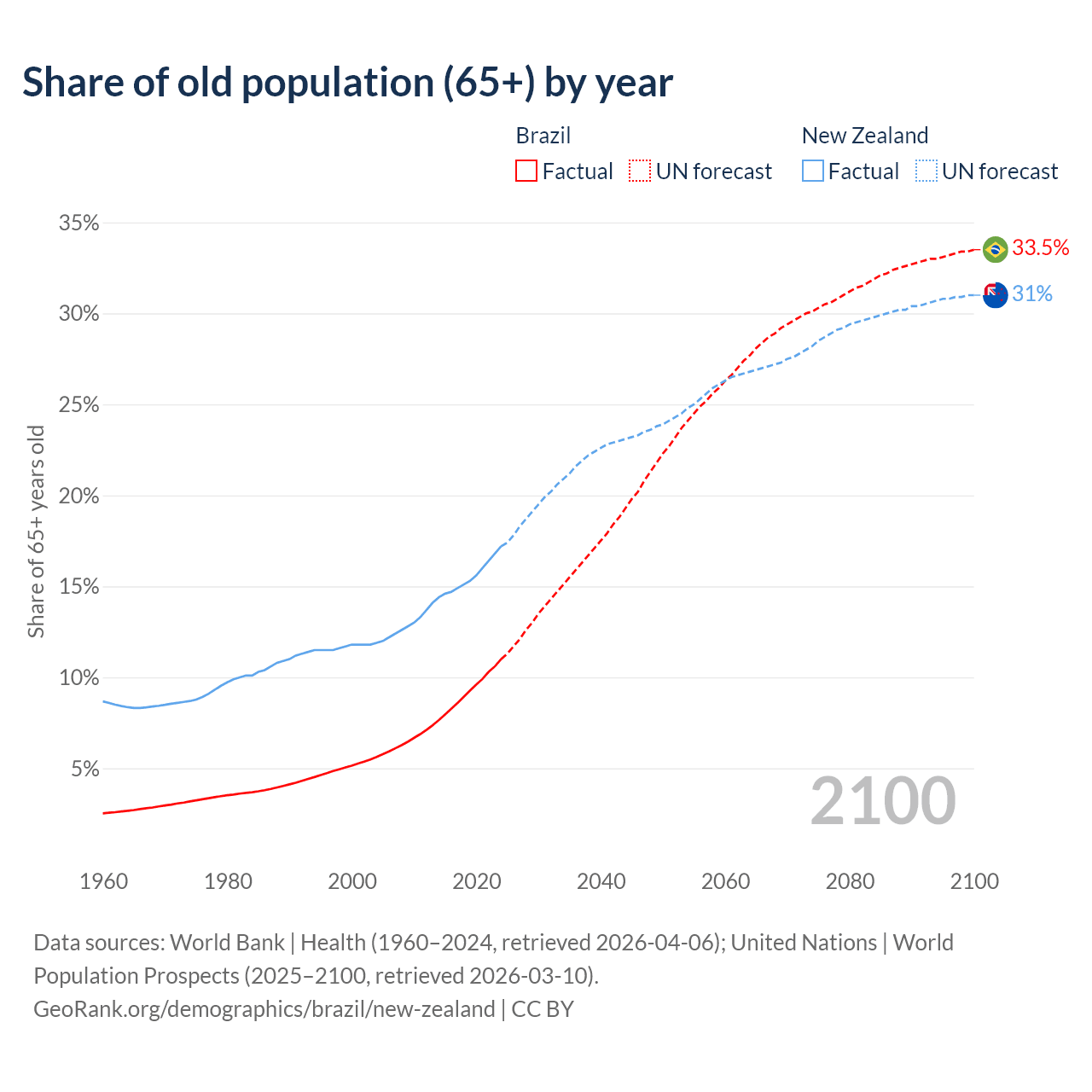 Median age Brazil vs New Zealand, 1960-2100
