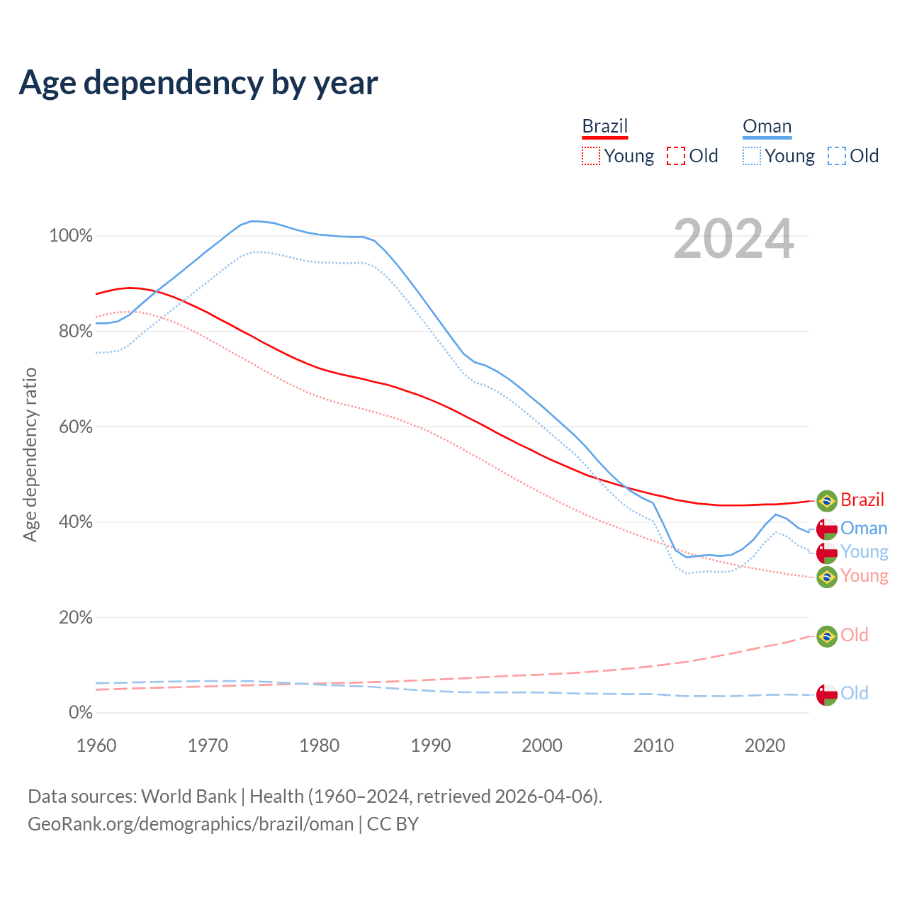 - Brazil is ranked 73/196 by median age (oldest to youngest) vs 101/196 for Oman.