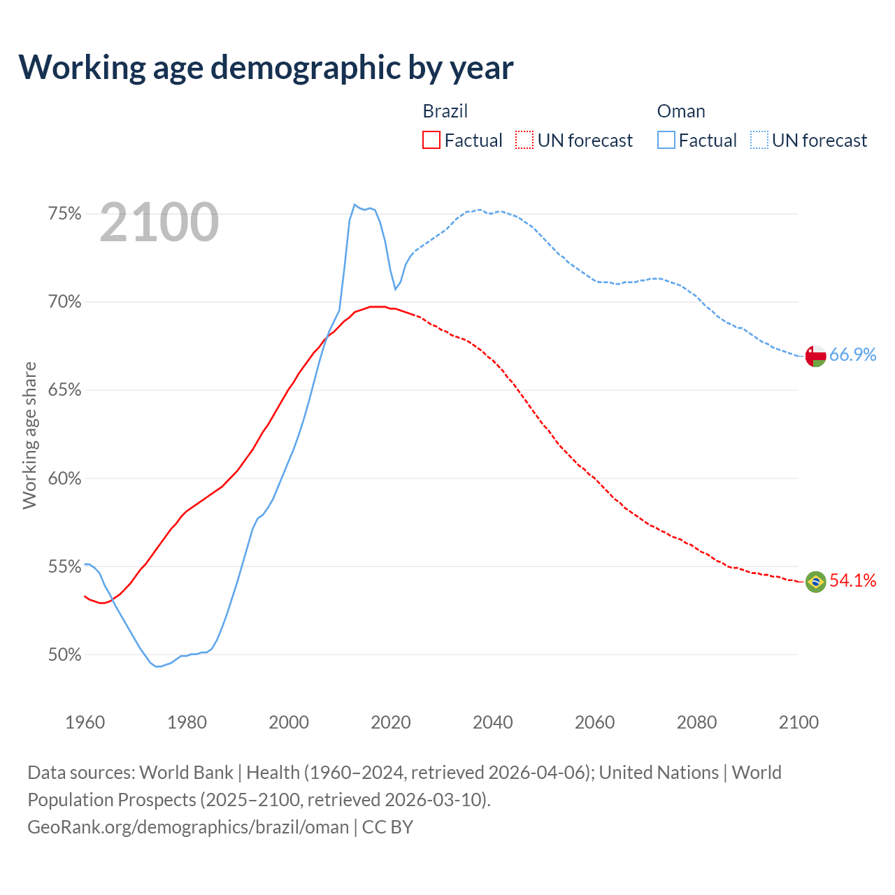 Median age Brazil vs Oman, 1960-2100