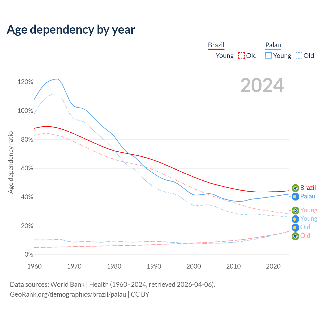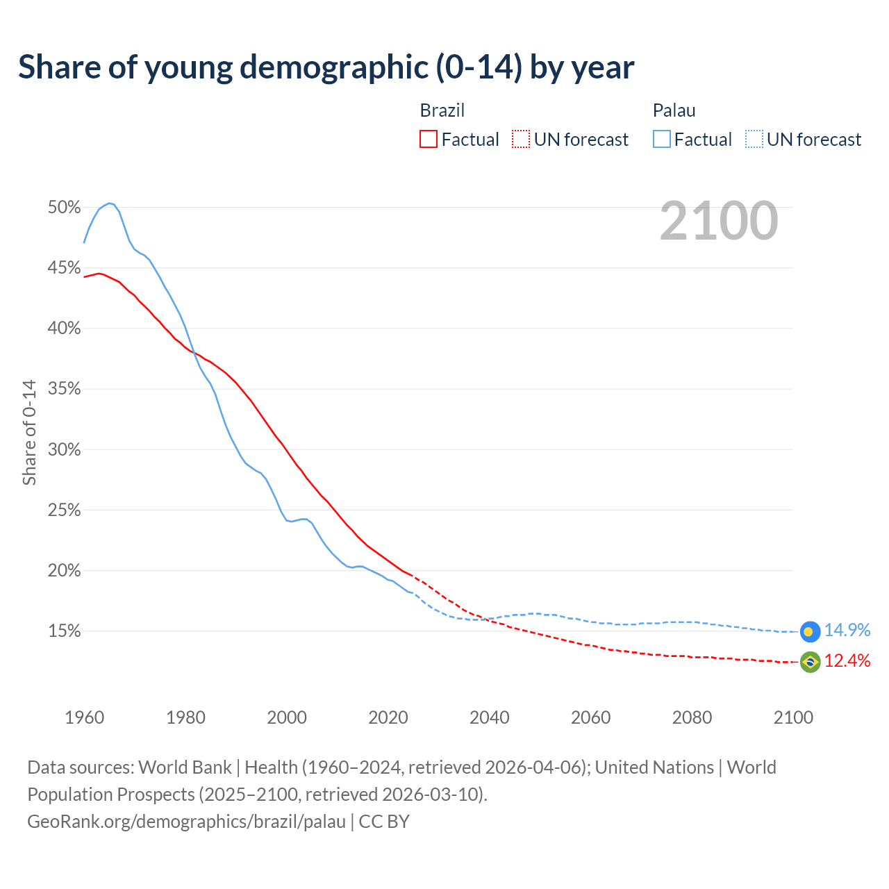 - The share of young demographic (0-15 years old) in Brazil is 19.7% vs 18.2% in Palau.