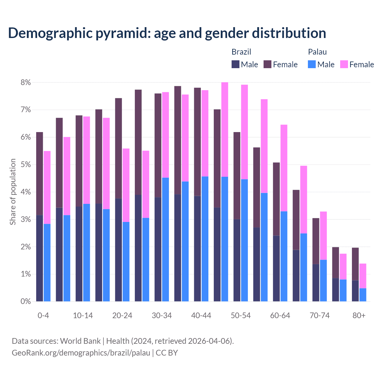 The share of older people aged 65 and over is 11% in Brazil and 11.3% in Palau. Life expectancy in Brazil compared to Palau .