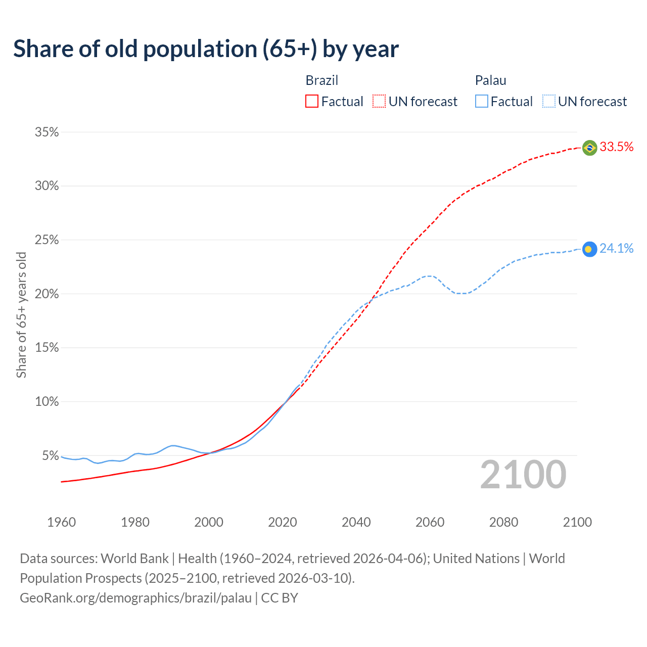 - The share of old-age demographic (65+) in Brazil is 11% vs 11.3% in Palau.