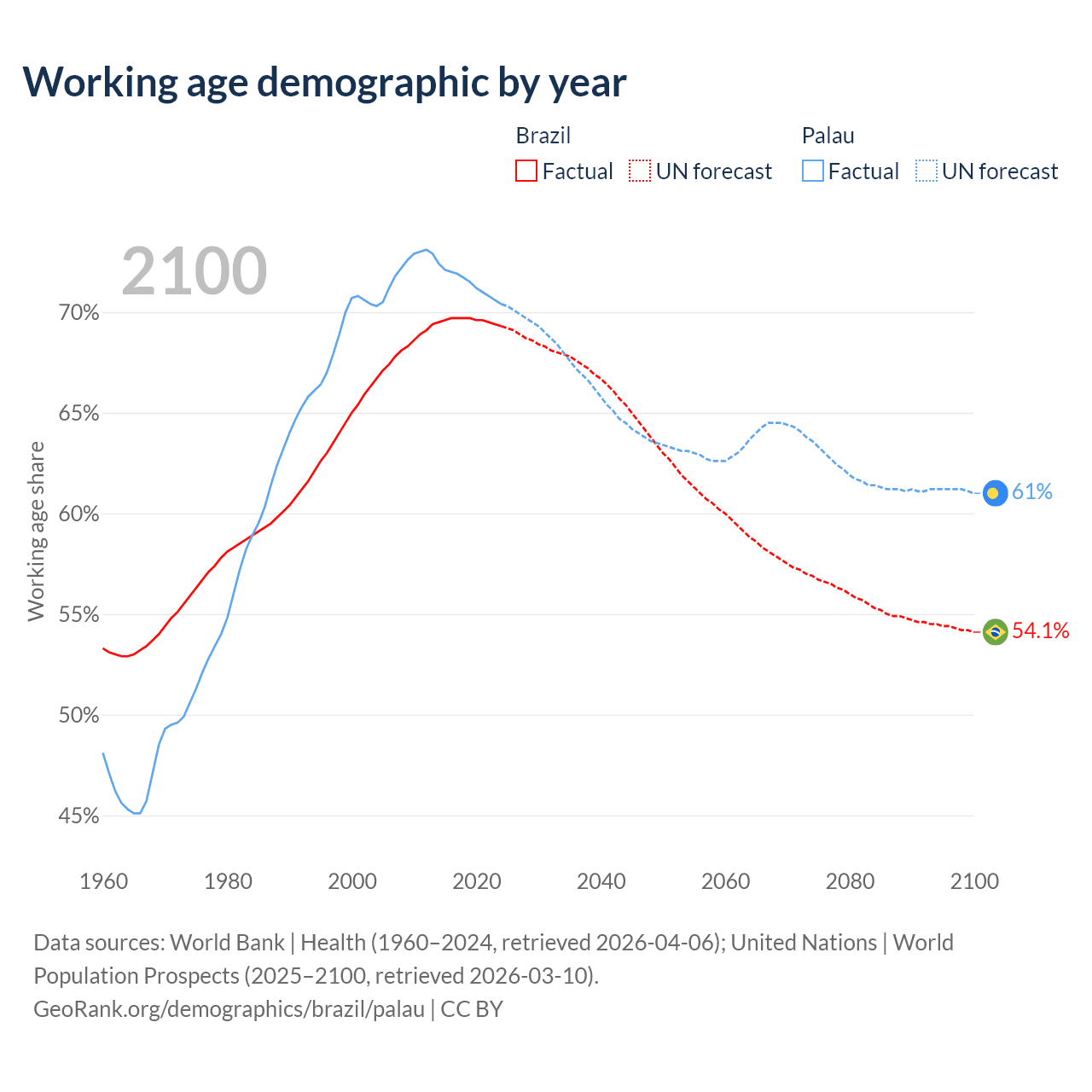 Median age Brazil vs Palau, 1960-2100