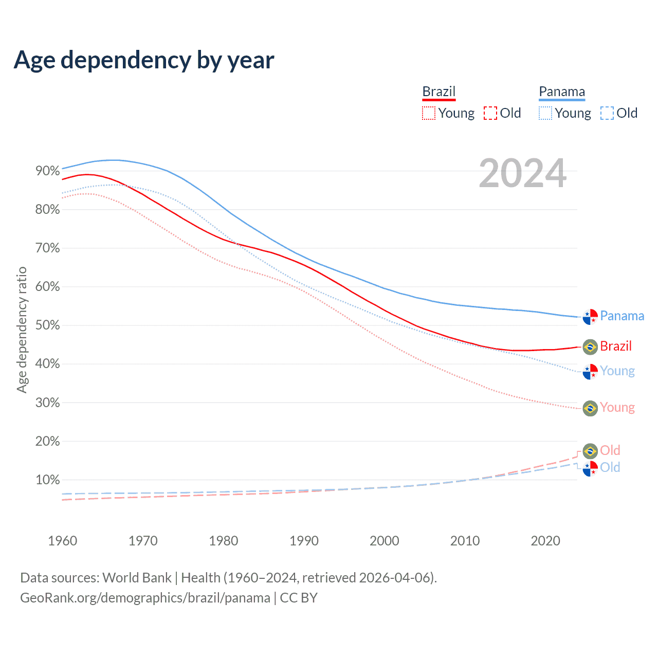 Data sources: World Bank | Health (1960–2024, retrieved 2026-04-06); U.S. Census Bureau (1960–2024, retrieved 2026-02-08).