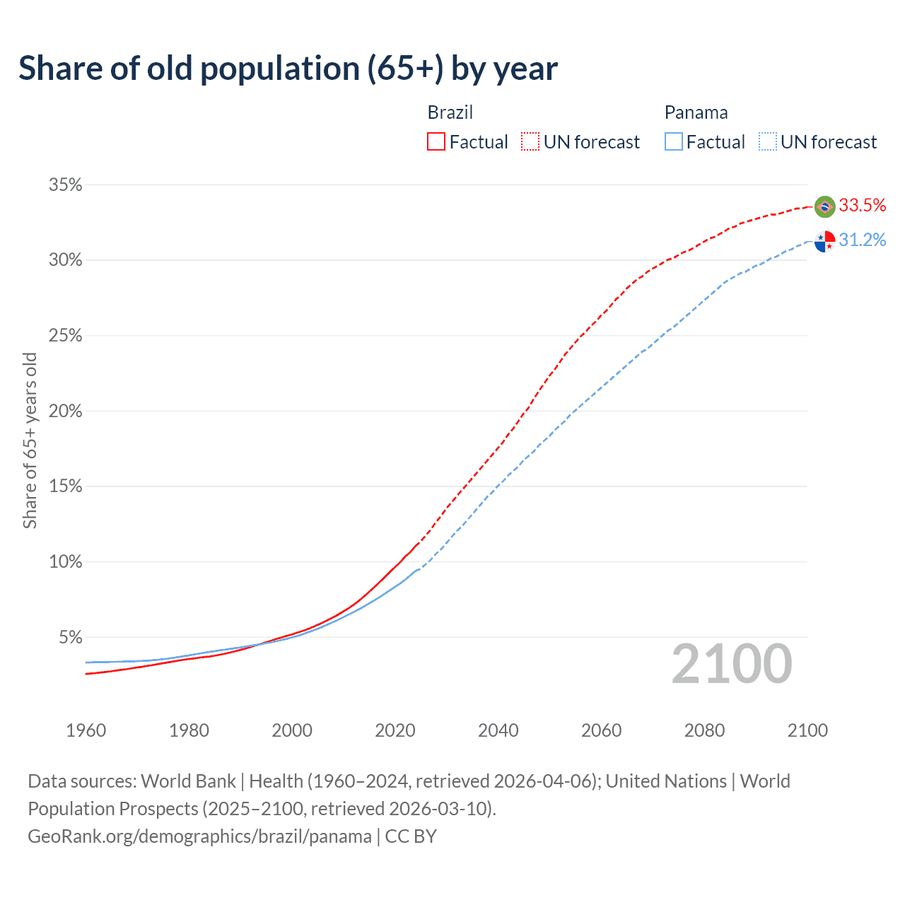 The share of older people aged 65 and over is 11% in Brazil and 9.35% in Panama. Life expectancy in Brazil compared to Panama .