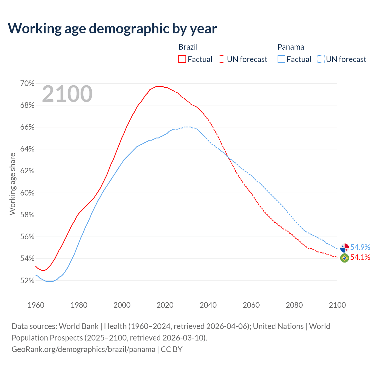 Median age Brazil vs Panama, 1960-2100